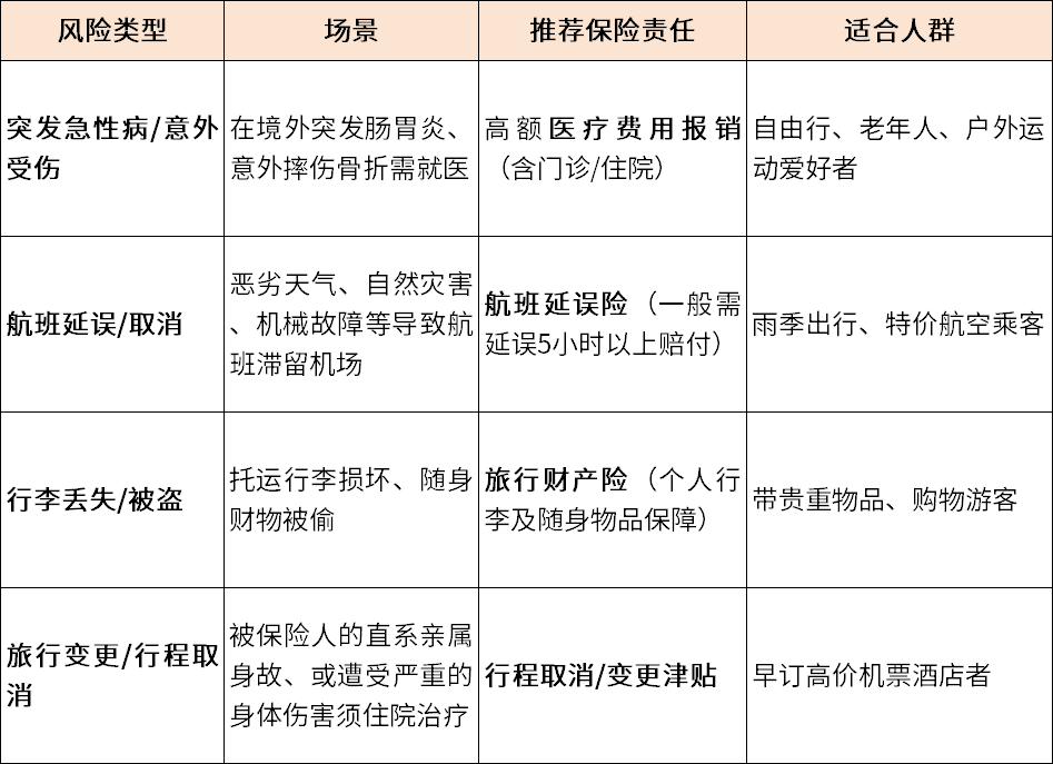 不同目的地和旅行方式,面临的风险不同,保险需求也有差异: