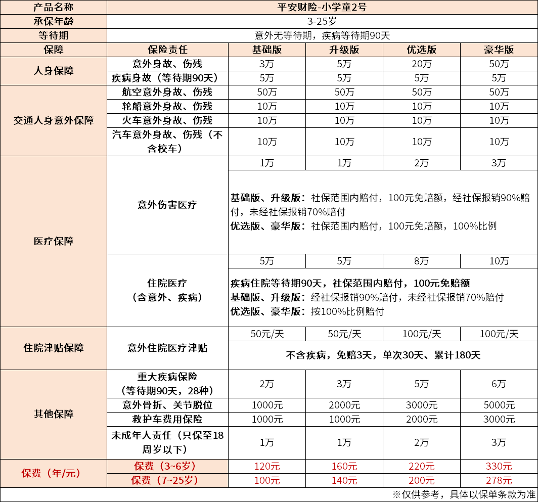 学平险以“高性价比”著称,3-6岁120元/年起,7-25岁100元/年起,相当于每天不到3毛钱。