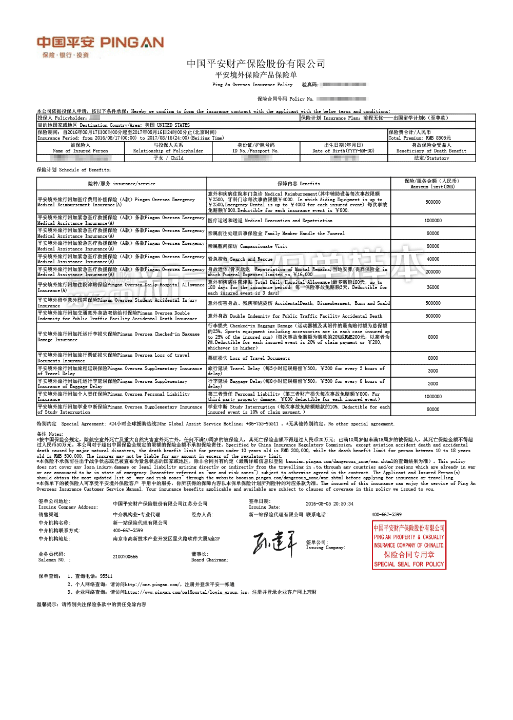 | 旅行证件遗失 | 8000元 | 保障被保险人在保险期间内,如在留学时,因盗抢遗失证件(护照、旅行交通票据、其他旅行所须证件),且向当地警方报警并取得警方书面证明,给付合理的证件重置费、办理重置所须的交通费和住宿费。 |