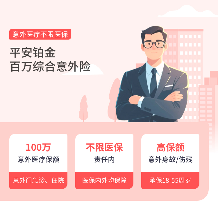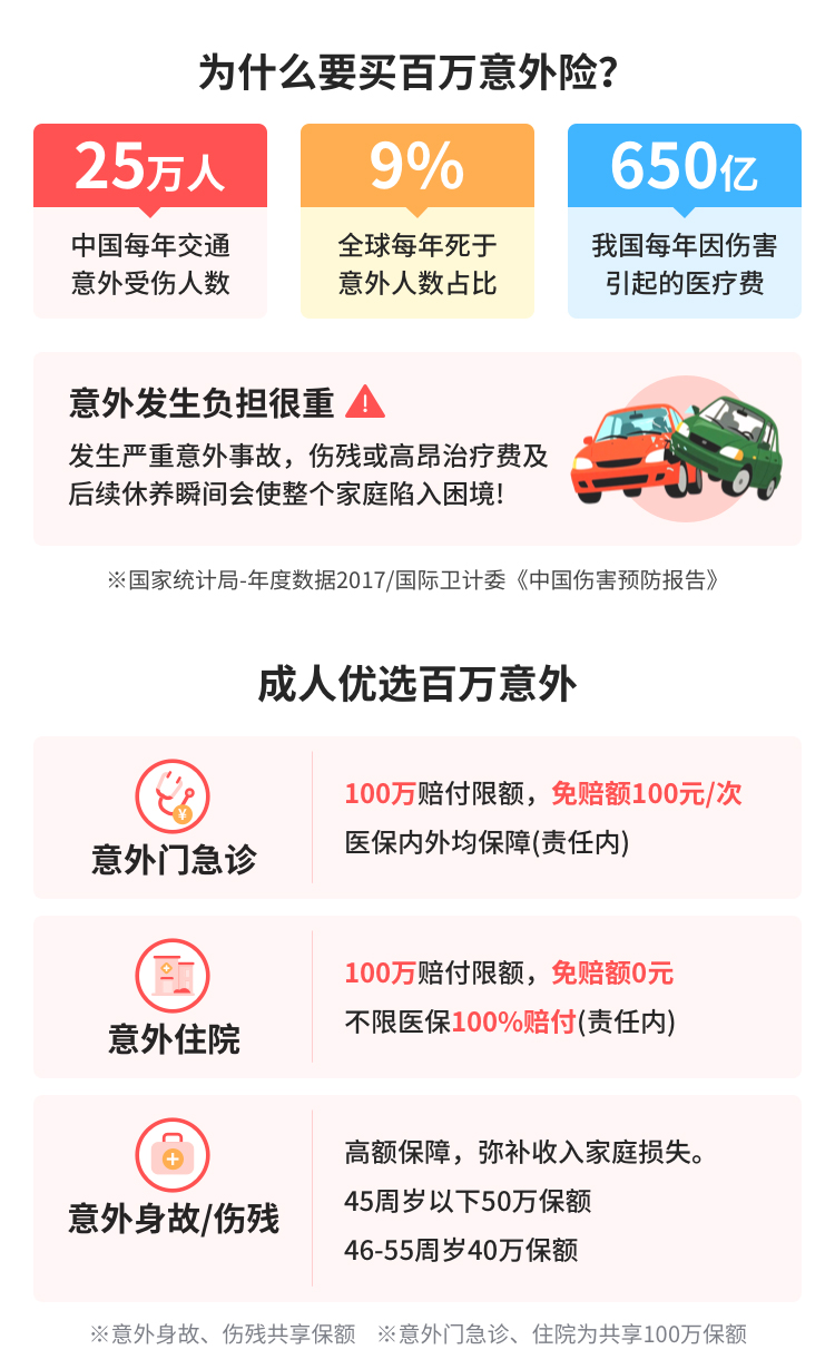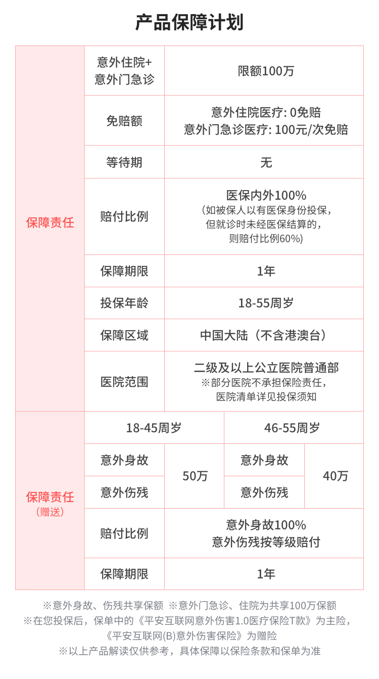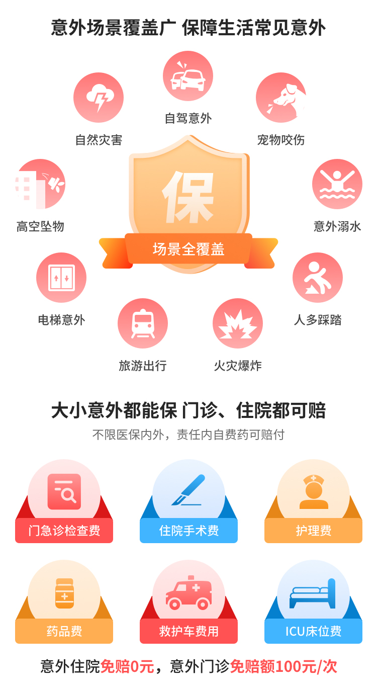 | 意外住院、门急诊医疗 | 100万元 | 意外住院保障: 保障被保险人在保险期间内,因遭受意外伤害经医院诊断必须住院治疗的,对于被保险人在住院期间发生的必须由被保险人个人自行承担的合理且必要的床位费、陪床费、重症监护室床位费、膳食费、护理费、治疗费、检查检验费、药品费、医疗器械使用费、医生诊疗费、手术费和救护车使用费(上述费用统称为“住院医疗费用”), 若被保险人已从其他途径(包括基本医疗保险、公费医疗、城乡居民大病保险、工作单位、第三方侵权责任人(包含法人)或保险公司在内的任何商业保险机构等)取得补偿的,扣除被保险人所取得的医疗费用补偿后,按免赔额0元,100%比例给付保险金,但若被保险人在投保时选择以有基本医疗保险或公费医疗身份投保,但在医院就诊时未经基本医疗保险或公费医疗结算,则赔付比例为60%。意外住院医疗与意外门诊医疗合计给付金额不超过100万元。 意外门急诊保障: 保障被保险人在保险期间内,因遭受意外伤害,在医院门诊部门或急诊部门发生的门诊急诊医疗费用和门诊手术费用, 若被保险人已从其他途径(包括基本医疗保险、公费医疗、城乡居民大病保险、工作单位、第三方侵权责任人(包含法人)或保险公司在内的任何商业保险机构等)取得补偿的,扣除被保险人所取得的医疗费用补偿后,按每次免赔额100元,100%比例给付保险金,但若被保险人在投保时选择以有基本医疗保险或公费医疗身份投保,但在医院就诊时未经基本医疗保险或公费医疗结算,则赔付比例为60%。意外住院医疗与意外门诊医疗合计给付金额不超过100万元。 |