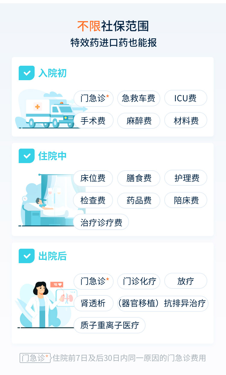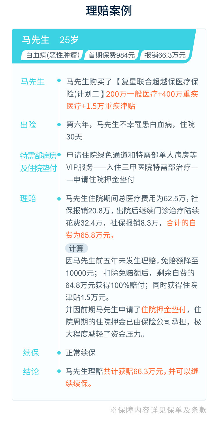 (1)如以参加医保(城镇职工、居民社会基本医疗保险、新型农村合作医疗保险)身份投保,但未使用医保就诊并结算,按年免赔额1.5万元,60%比例给付保险金(此项不适用于质子重离子医疗费用保险责任); (2)“一般医疗保险金”与“重大疾病医疗保险金”保障,累计保险金给付限额为400万元; (3)已从其它途径(不含社会医疗保险或公费医疗)获得的医疗费用补偿可抵扣免赔额; (4)“一般医疗保险金”与“重大疾病医疗保险金”保障,共同使用1.5万元年免赔额; (5)如本合同保险期间届满时恶性肿瘤治疗仍未结束的,在首个续保的保险期间内,保险公司继续承担赔偿恶性肿瘤院外特定药品费用责任,在此之后,续保或重新投保的保险期间内,保险公司不再承担恶性肿瘤院外特定药品费用责任。 |