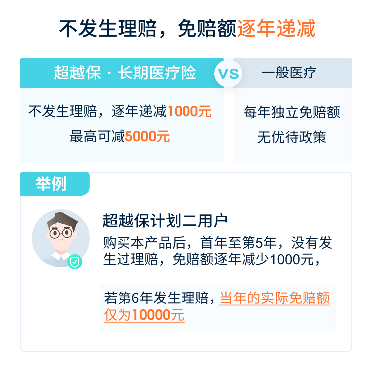 (1)如以参加医保(城镇职工、居民社会基本医疗保险、新型农村合作医疗保险)身份投保,但未使用医保就诊并结算,按年免赔额1.5万元,60%比例给付保险金; (2)“一般医疗保险金”与“重大疾病医疗保险金”保障,累计保险金给付限额为400万元; (3)已从其它途径(不含社会医疗保险或公费医疗)获得的医疗费用补偿可抵扣免赔额; (4)“一般医疗保险金”与“重大疾病医疗保险金”保障,共同使用1.5万元年免赔额。 |