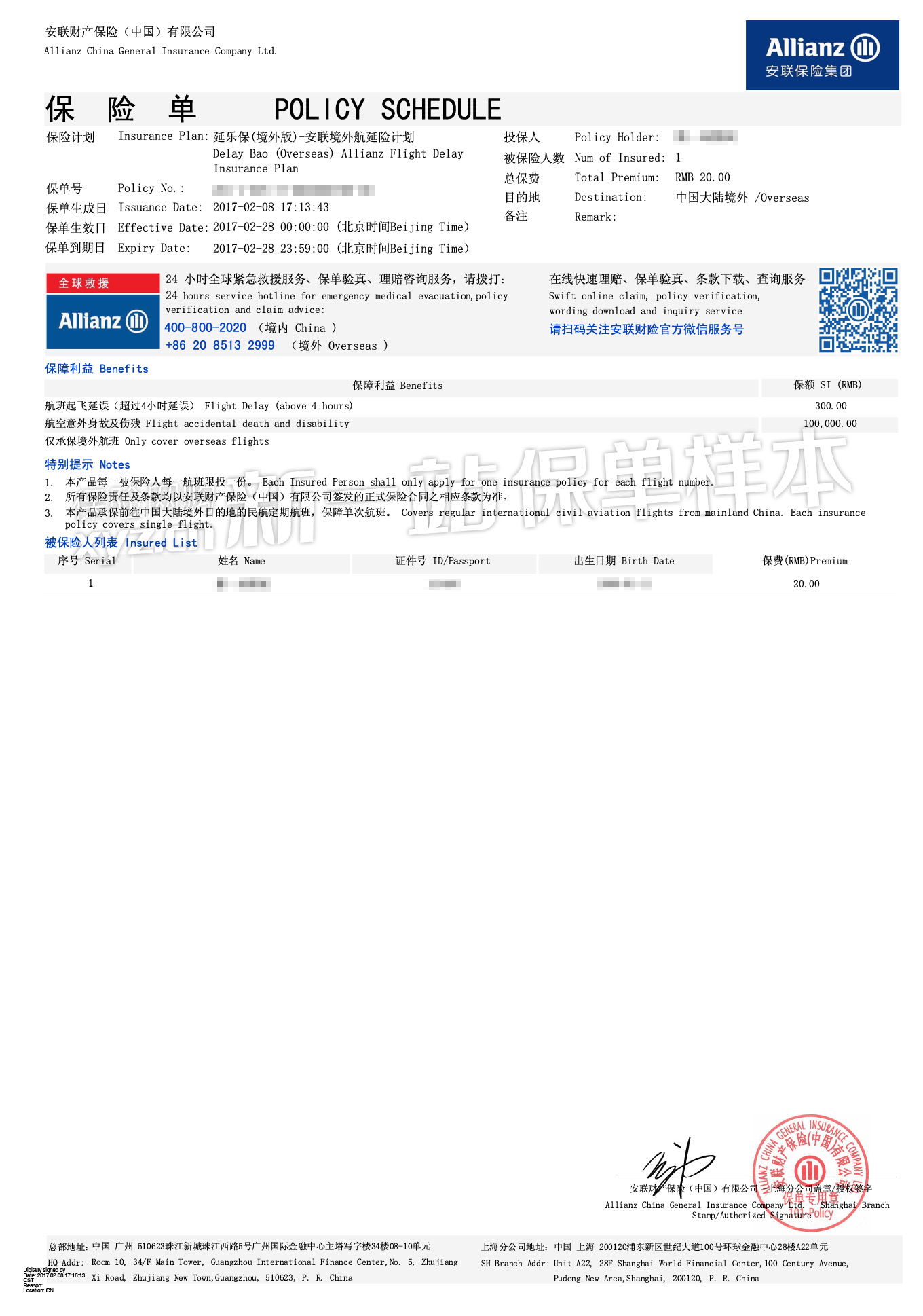 【保额说明】安联财产保险(中国)有限公司申明:每一航班限投一份,如同一被保险人投保该公司2份以上(含2份)保险(不含团体保险),同类保障按其中最高一项保额给付保险金。