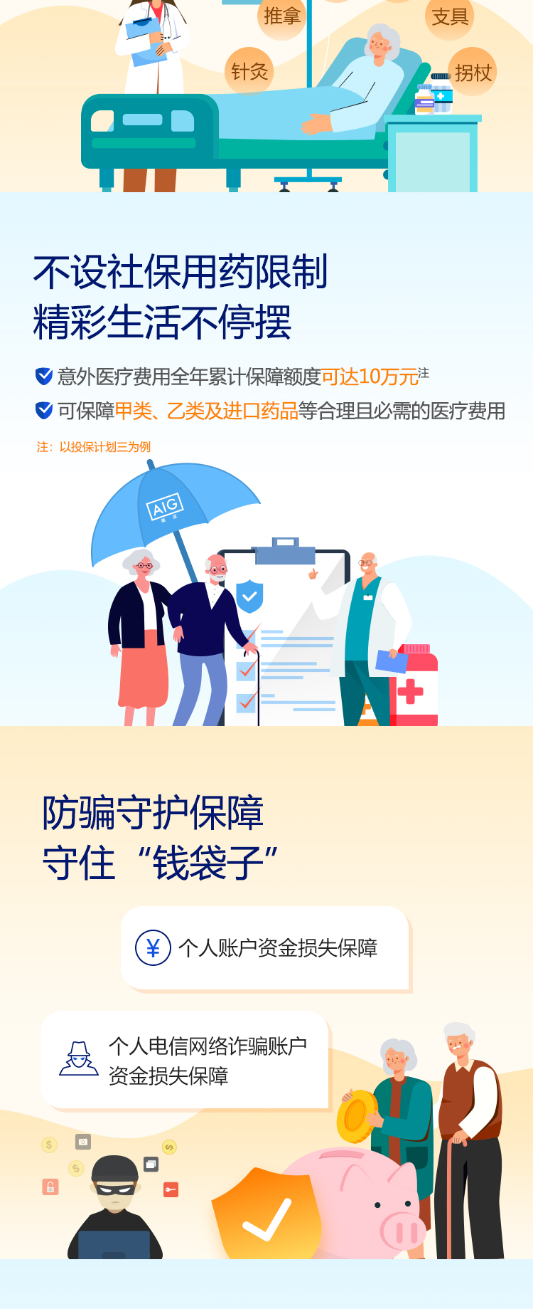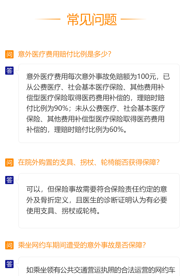 - 对于意外医药补偿保障,其适用的保险金额为保障明细页面对应所载保险金额的一半,但该保障项下骨折物理治疗费用和骨折护具费用适用的每次意外事故赔偿限额仍以保障明细页面对应所载限额为准。