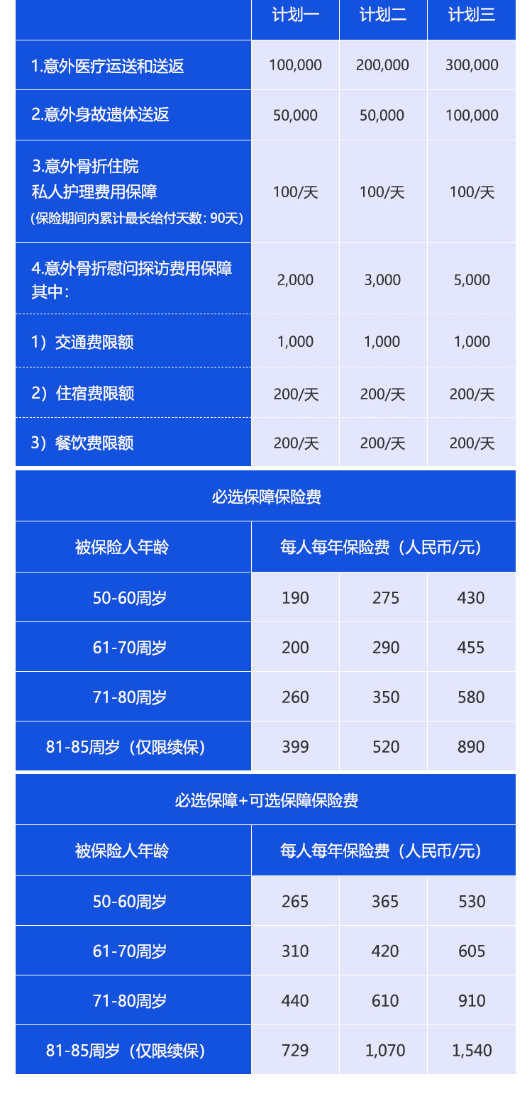 | 意外医疗运送和送返 | 不投保 | 保障被保险人在保障期间内,于境内日常居住地或境内日常工作地所在的市级行政区域之外遭遇意外事故,经保险公司指定的支援服务机构或其授权代表从医疗角度认定为有运送必要的,则将该被保险人送至当地或其他就近地区符合治疗条件的医院。经保险公司指定的支援服务机构或其授权代表从医疗角度认定为有送返必要的,则将该被保险人送返至其合法有效证件所载的住所地或境内日常居住地或境内日常工作地。 任何未经指定的支援服务机构或其授权代表批准并安排的费用,保险公司不负责赔偿;倘若在紧急医疗情况下,该被保险人出于某种原因无法通知保险公司指定的支援服务机构,保险公司将有权根据您所选择的保险计划,以及在相同情况下由我们指定的支援服务机构提供或安排服务所需要的合理的费用进行赔偿。 保险单生效时年龄在66周岁(含)及以上的被保险人,保险金额为保障明细页面对应所载保险金额的一半。 |
