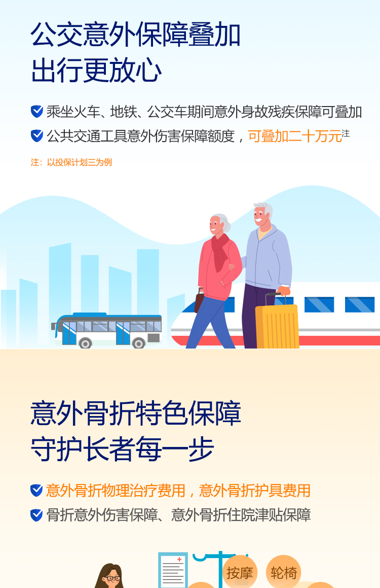 | 意外骨折慰问探访费用保障 | 不投保 | 保障被保险人在保险期间内,因遭遇意外事故导致骨折并以该骨折为直接且单独原因住院连续七天以上(含首尾两日),将以保险单所载本附加合同项下该被保险人相应的保险金额为限,补偿该被保险人的一名异地成年直系亲属因此前往被保险人所在地进行探访期间实际支出的必需且合理的交通费(如为机票、船票或火车票,则仅限经济舱、二等舱或二等座及以下票款)、住宿费和餐饮费,其中: (1)交通费限额1000元,住宿费限额200元/天,餐饮费限额200元/天;66周岁(含)及以上的被保险人交通费限额500元,住宿费限额100元/天,餐饮费限额100元/天 (2)累计给付限额以保单约定为准。 保险单生效时年龄在66周岁(含)及以上的被保险人,保险金额为保障明细页面对应所载保险金额的一半。 |