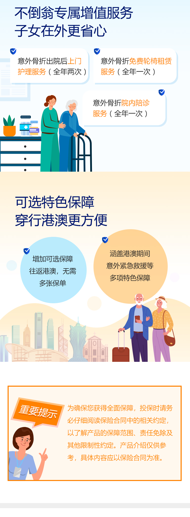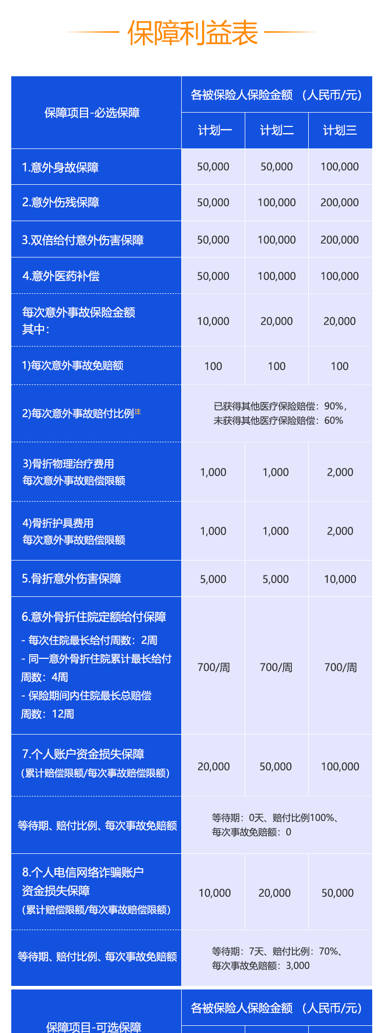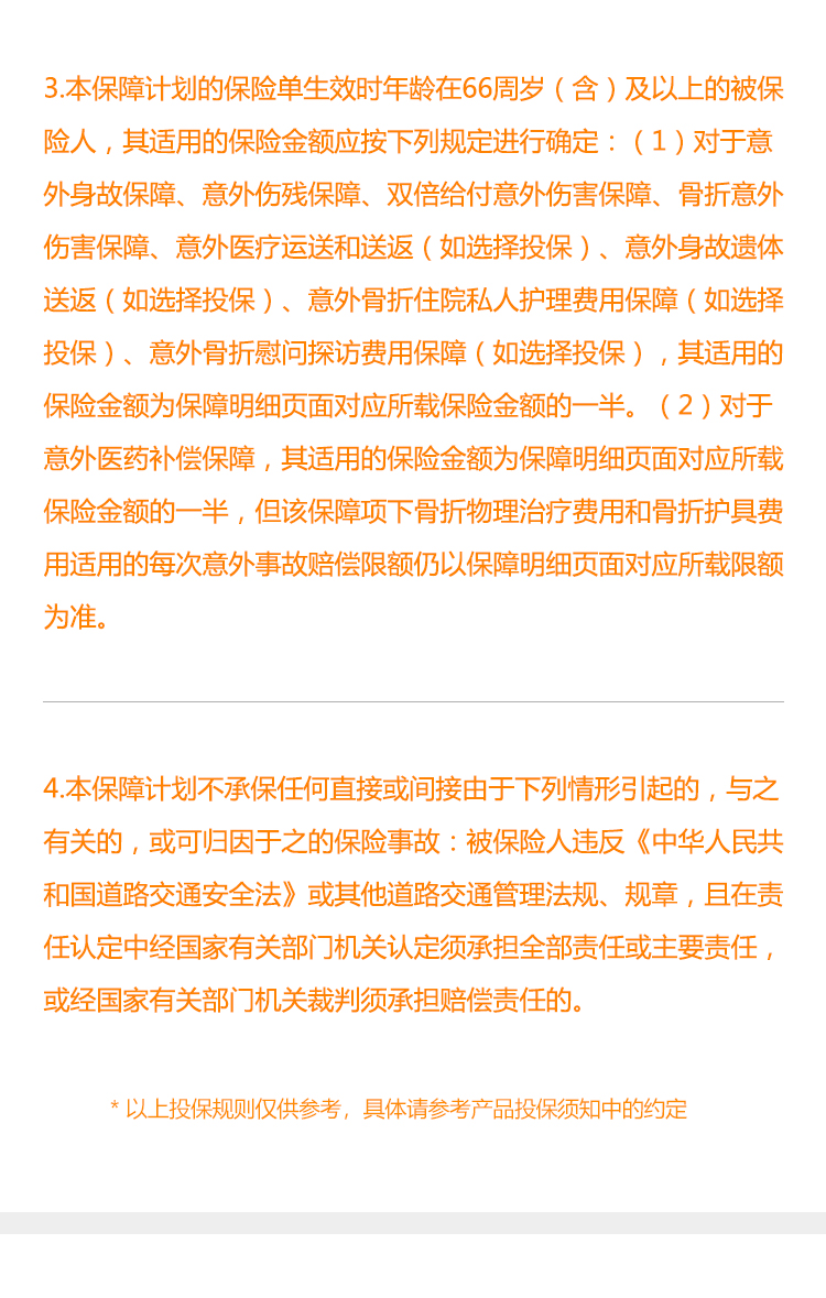 - 对于意外身故保障、意外伤残保障、双倍给付意外伤害保障、骨折意外伤害保障、意外医疗运送和送返(如选择投保)、意外身故遗体送返(如选择投保)、意外骨折住院私人护理费用保障(如选择投保)、意外骨折慰问探访费用保障(如选择投保),其适用的保险金额为保障明细页面对应所载保险金额的一半。