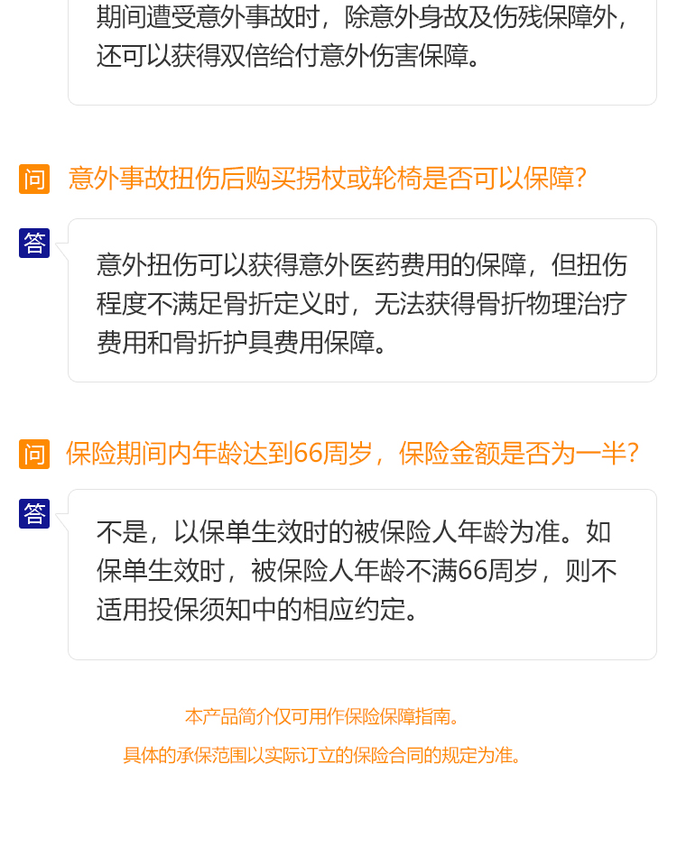 | 意外伤残保障 | 5万元 | 保障被保险人在保险期间内,如遭遇意外事故,且自该事故发生之日起180日内,因该事故伤残,按《人身保险伤残评定标准及代码》(保监发[2014]6 号,标准编号为 JR/T 0083-2013,以下简称“评定标准”)中所列的伤残项目,给付意外伤残保险金予该被保险人,该给付金额为按所致伤残根据评定标准评定的伤残程度等级相对应的给付比例乘以本合同保险单上所载该被保险人相应的保险金额计算。 保险单生效时年龄在66周岁(含)及以上的被保险人,保险金额为保障明细页面对应所载保险金额的一半。