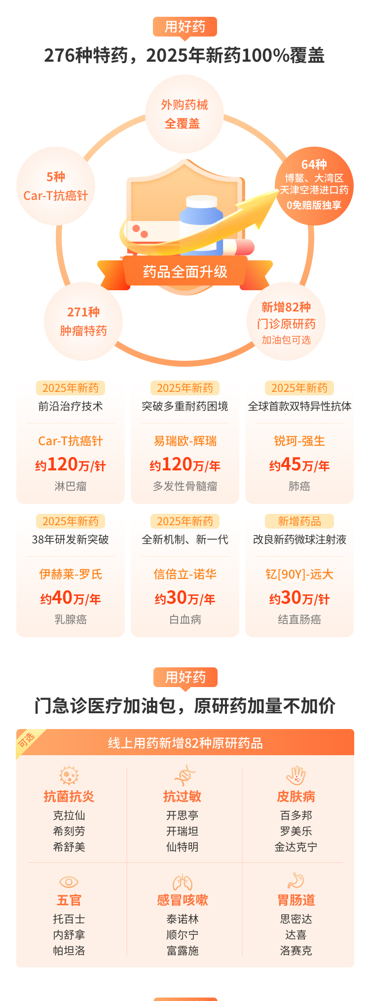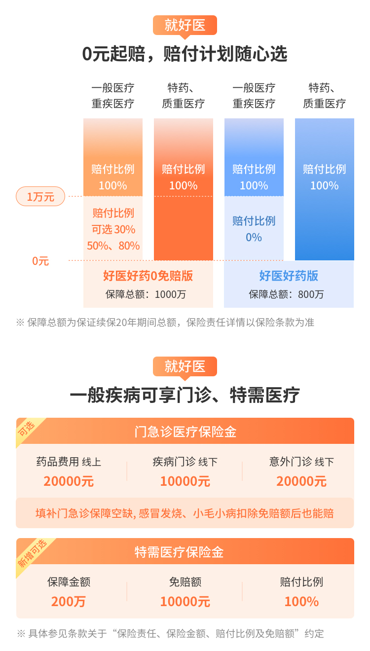 | 重大疾病医疗保险金 | 600万元(计划一) | 一般情况下,一般医疗保险金、重大疾病医疗保险金责任范围内的加总金额1万元(含)以下部分赔付比例根据您投保时所选择的计划确定,有30%、50%、80%三档,1万元以上部分赔付比例100%;但若被保险人在投保时选择以有公费医疗或基本医疗保险身份投保,但在就诊时未按公费医疗、基本医疗保险或城乡居民大病保险有关规定取得医疗费用补偿的,则赔付比例需要额外乘以60%。 *注:具体外购药品和外购医疗器械目录以官网实时最新展示为准 若被保险人因遭受意外伤害或在等待期90日后因意外伤害以外的原因,被确诊初次发生本保险条款“8.1重大疾病的定义”约定的重大疾病,在保险公司指定医疗机构普通部(不包括特需医疗部、国际医疗部、外宾医疗部、VIP部、干部病房,下同)接受治疗的,对于被保险人因治疗该重大疾病在该医疗机构发生的合理且必要的下列医疗费用,保险公司按本保险条款“2.5.7保险金计算方法”计算并赔付重大疾病医疗保险金: (1) 住院医疗费用 指被保险人在保险公司指定医疗机构普通部普通病房(包括重症监护病房)住院期间,在该医疗机构所发生的合理且必要的住院医疗费用(指本合同约定的药品费及其他住院医疗费用)。被保险人在保险期间内开始住院治疗,到保险期间届满时住院仍未结束的,保险公司继续承担重大疾病医疗保险金赔付责任至住院结束, 但最长不超过保险期间届满之日起第30日。 (2) 特殊门诊医疗费用 指被保险人在保险公司指定医疗机构普通部接受特殊门诊治疗,在该医疗机构所发生的合理且必要的特殊门诊医疗费用,其中包括门诊肾透析费、门诊恶性肿瘤——重度治疗费、器官移植后的门诊抗排异治疗费。 (3)门诊手术医疗费用 指被保险人在保险公司指定医疗机构普通部接受门诊手术治疗,在该医疗机构所发生的合理且必要的门诊手术医疗费用。 (4)住院前后门(急)诊医疗费用 指被保险人在保险公司指定医疗机构普通部住院治疗前 30 日(含住院当日)至出院后 30 日(含出院当日)内,因与该次住院相同原因在保险公司指定医疗机构普通部接受门(急)诊治疗,在该医疗机构所发生的合理且必要的门(急)诊医疗费用。 (5)外购药品及外购医疗器械费用 指被保险人在保险公司指定医疗机构以外的保险公司认可的药房购买的,符合本保险条款“2.5.2重大疾病医疗保险金”约定的住院医疗费用、特殊门诊医疗费用、门诊手术医疗费用以及住院前后门(急)诊医疗费用保险责任范围内的必须由被保险人个人自行承担的、满足以下条件的合理且必要的药品及医疗器械费用: 1) 外购药品和外购医疗器械是指因指定医疗机构药房没有该药物和医疗器械,导致其无法向被保险人提供,被保险人必须到指定医疗机构以外保险公司认可的药房购买的药品和医疗器械; 2) 外购药品和外购医疗器械的处方必须是由保险公司指定医疗机构的专科医生开具的; 3) 处方开具的外购药品和外购医疗器械必须是被保险人当前治疗所必备的; 4) 外购药品与外购医疗器械费用必须与国家药品监督管理部门批准的该药品说明书或医疗器械说明书中所列明的适应症和用法用量相符合; 5) 外购药品需具有国家药品监督管理部门核发的药品批准文号或者进口药品注册证书、医药产品注册证书;外购医疗器械需具有国家药品监督管理部门核发的医疗器械注册证编号或备案号; 6) 外购药品不包含靶向药物和免疫治疗药物,但本保险条款“2.5.4特定药品费用医疗保险金”及“2.5.5临床急需进口特定药品费用医疗保险金”保险责任,已将部分靶向药物和免疫治疗药物纳入保障范围并约定了药品清单,详见前述条款的约定; 7) 外购药品不包括根据中医药方组合一种或多种中医药材进行内服或外用的中草药药品费(如中草药饮片、中草药颗粒和中草药膏方等),以及中成药和辅助性药物等临床非紧急、非必需的药物;