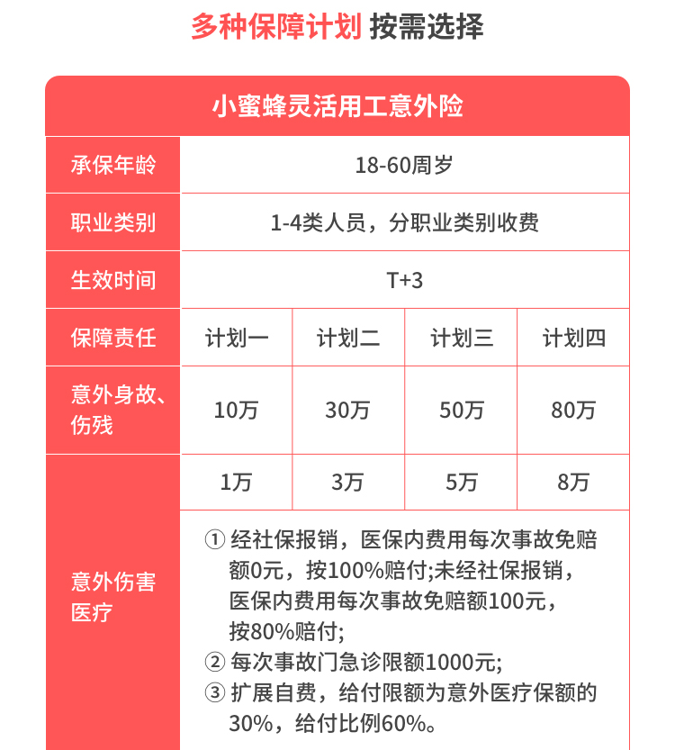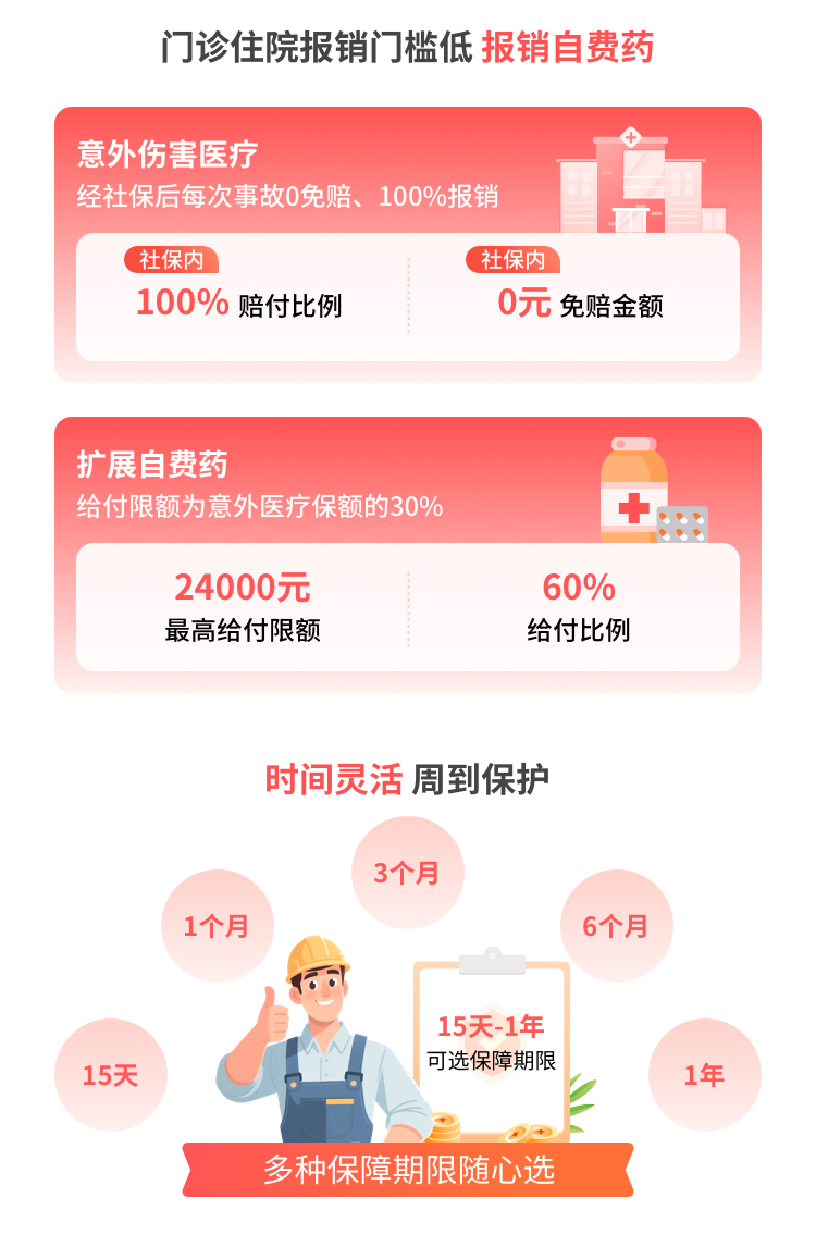 | 意外伤害医疗 | 1万元/3万元/5万元/8万元 | ①在保险期间内,被保险人遭受意外伤害,并因该意外伤害在中国境内(不含港澳台)二级或及二级以上的公立医院普通部进行治疗支出的必需且合理的、符合本保险合同签发地政府颁布的社会基本医疗保险报销范围的医疗费用,保险人在扣除社会基本医疗保险、公费医疗和任何第三方(包括任何商业医疗保险)已经补偿或给付部分以及本附加险合同约定的免赔额(以医保身份就诊并报销,每次事故免赔额0元;未以医保身份就诊并报销,每次事故免赔额100元)后,对其余额按本附加险合同约定的给付比例(以医保身份就诊并报销,给付比例100%;未以医保身份就诊并报销,给付比例80%)和门诊急诊限额(每次事故1000元)给付意外医疗保险金。扩展自费医疗责任,给付限额为意外医疗保额的30%,给付比例为60%,每次事故门诊急诊赔付限额1000元。