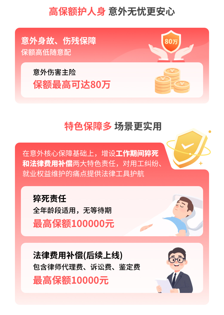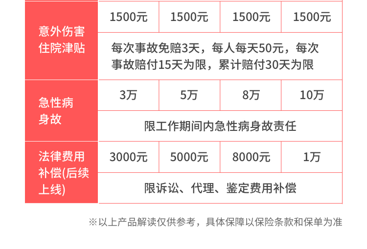 | 急性病身故(限工作期间内急性病身故责任) | 3万元/5万元/8万元/10万元 | 在保险期间内,被保险人在工作期间内突发急性病(指被保险人突然发生、不及时救治将危及生命安危的急性疾病),并自发病之日起三日内因该急性病导致身故的,保险人依照本附加险合同项下该被保险人的保险金额给付身故保险金,对该被保险人的保险责任终止。