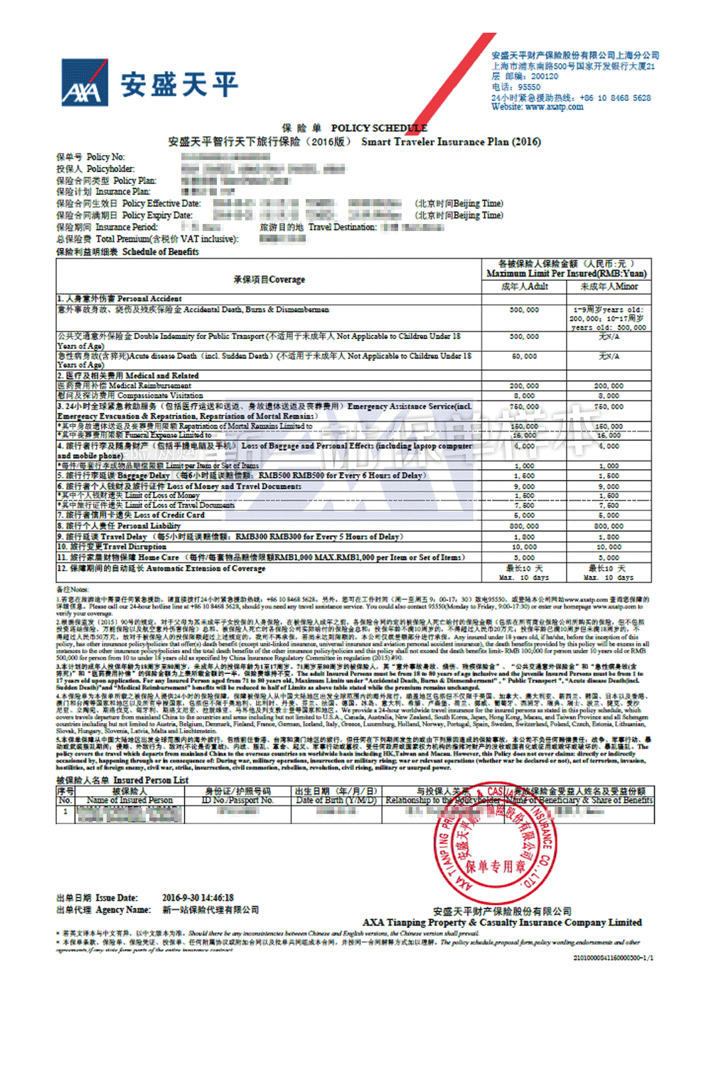 - 5、附加个人旅行者个人钱财及旅行证件遗失保险条款(2016年第一版)-安盛天平(安盛天平)(备-普通意外保险)【2016】(附)017号