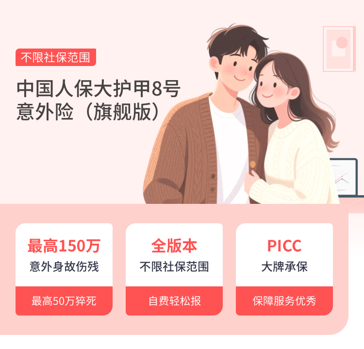 - 中国人保大护甲8号意外险(旗舰版)条款中国人民财产保险股份有限公司意外伤害保险(互联网专属)条款(注册号: C00000232312021122732193);意外伤害保险 B 款(互联网专属)条款(注 册号:C00000232312022012700681);附加意外伤害医疗保险 A 款(互联网专属)条款(注册号: C00000232522021122029123);附加意外伤害住院津贴保险 A 款(互联网专属)条款(注册号: C00000232522021122434983);附加急性病身故保险(互联网专属)条款(注册号: C00000231922021122838493);交通工具乘客意外伤害保险 2024 版(互联网专属)条款(注册号: C00000232312025031312643);交通出行人身意外伤害保险 A 款(互联网专属)条款(注册号: C00000232312021122438183);附加意外伤害骨折和脱臼保险(互联网专属)条款(注册号: C00000232322022012384393);预防接种医疗意外保险(互联网专属)条款(注册号: C000002134012022011302361);附加扩展承保自费医疗费用保险 A 款(互联网专属)条款(注册号: C00000232522021122328183);附加救护车费用保险 A 款(互联网专属)条款(注册号: C00000232522021122951643);附加扩展高风险运动保险(互联网专属)条款(注册号: C00000231922021123165793);附加调整意外健康险保险金额保险(互联网专属)条款(注册号: C00000231922021122030243);附加法定节假日意外伤害双倍给付 保险(互联网专属)条款(注册号:C00000231922021123170103)