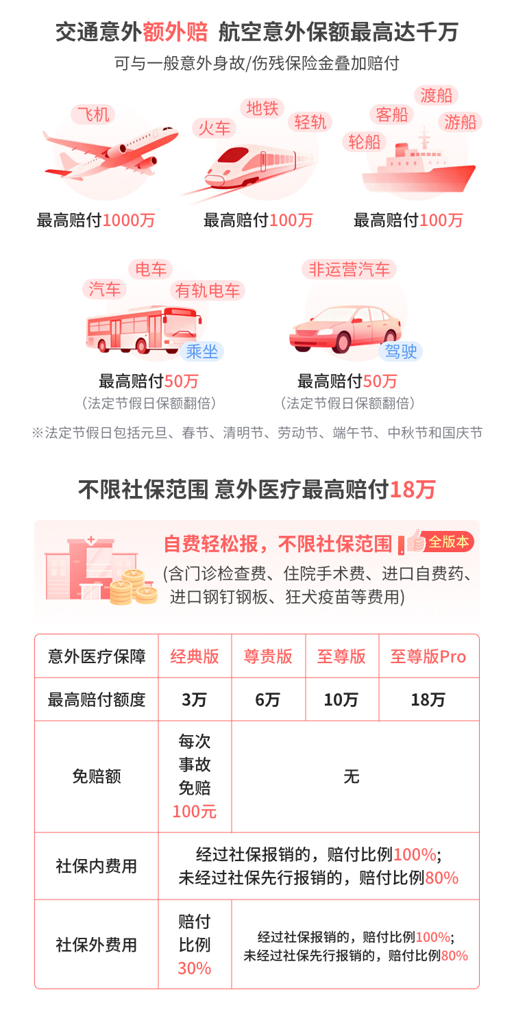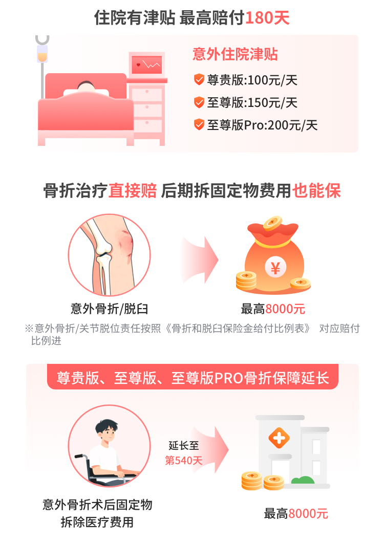 | 意外医疗(含门急诊和住院) | 3万元 | 经典版: 保障被保险人自获得被保资格之日起且在保险期间内,如因遭受遭受意外伤害,并因该意外伤害在保险期间内在指定医疗机构进行治疗,对自事故发生之日起180日内发生的,需个人支付的合理且必要的医疗费用,在扣除社会基本医疗保险、公费医疗和任何第三方(包括任何商业医疗保险)已经补偿或给付部分后,每次事故按免赔额100元,如下比例给付保险金: (1)给付比例:对被保险人实际支付的符合治疗所在地政府颁布的基本医疗保险报销范围的医疗费用,保险公司在扣除社会基本医疗保险、公费医疗保险和从其他途径已经补偿部分后,对其余额:在符合补偿原则前提下,就同一事故,针对经过基本医疗保险先行结算的索赔,对其余额按100%比例给付,针对未经过基本医疗保险先行结算的索赔,对其余额按80%比例给付;扣除免赔额后,对被保险人实际支付的部分自费医疗费用中被保险人自付的部分和完全自费医疗费用,按30%比例给付。 (2)保险期间届满被保险人治疗仍未结束的,保险公司所负保险责任期限可按下列约定延长:门诊急诊治疗者,自保险期间届满次日起计算,以15日为限;保险期间届满被保险人仍在住院治疗的,自保险期间届满次日起计算,至出院之日止,最长以90日为限。 尊贵版/至尊版/至尊版pro: 保障被保险人自获得被保资格之日起且在保险期间内,如因遭受遭受意外伤害,并因该意外伤害在保险期间内在指定医疗机构进行治疗,对自事故发生之日起180日内发生的,需个人支付的合理且必要的医疗费用,在扣除社会基本医疗保险、公费医疗和任何第三方(包括任何商业医疗保险)已经补偿或给付部分后,每次事故按免赔额0元,如下比例给付保险金: (1)给付比例:若已从基本医疗保险或公费医疗取得医疗费用补偿的,赔付比例为100%;若未从基本医疗保险或公费医疗取得医疗费用补偿的,赔付比例为80%; (2)保险期间届满被保险人治疗仍未结束的,保险公司所负保险责任期限可按下列约定延长:门诊急诊治疗者,自保险期间届满次日起计算,以15日为限;保险期间届满被保险人仍在住院治疗的,自保险期间届满次日起计算,至出院之日止,最长以90日为限。