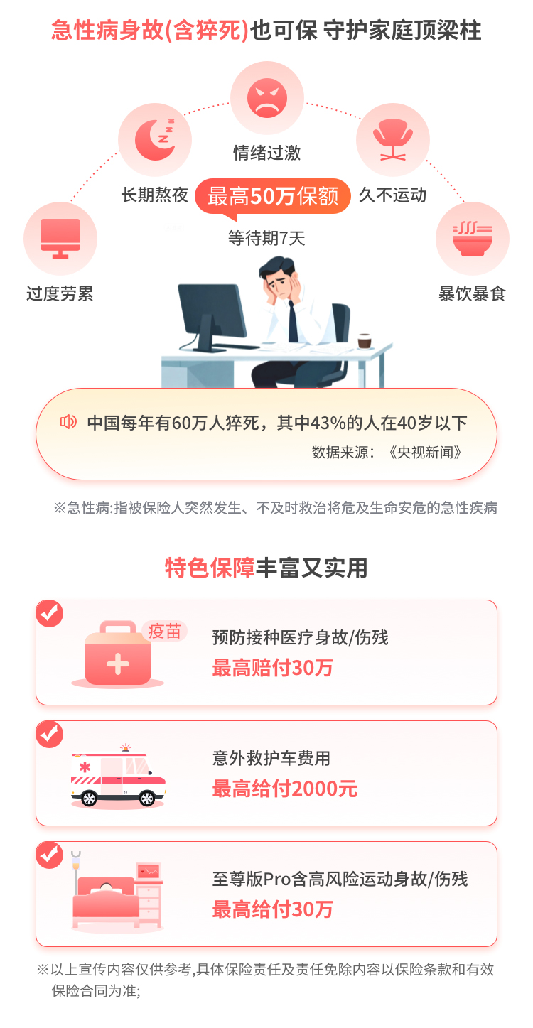 | 急性病身故 | 15万元 | 保障被保险人在保险期间内,自获得被保资格之日起,在等待期7天后,在保险期间内突发急性病(含猝死,猝死是指由潜在疾病、身体机能障碍或其他非外来性原因所导致的、在出现急性症状后发生的突然死亡,以医院的诊断或公安、司法机关的鉴定为准),并自发病之日起3日内因该急性病导致身故的,依照本附加险合同项下该被保险人的保险金额给付身故保险金,对该被保险人的保险责任终止。