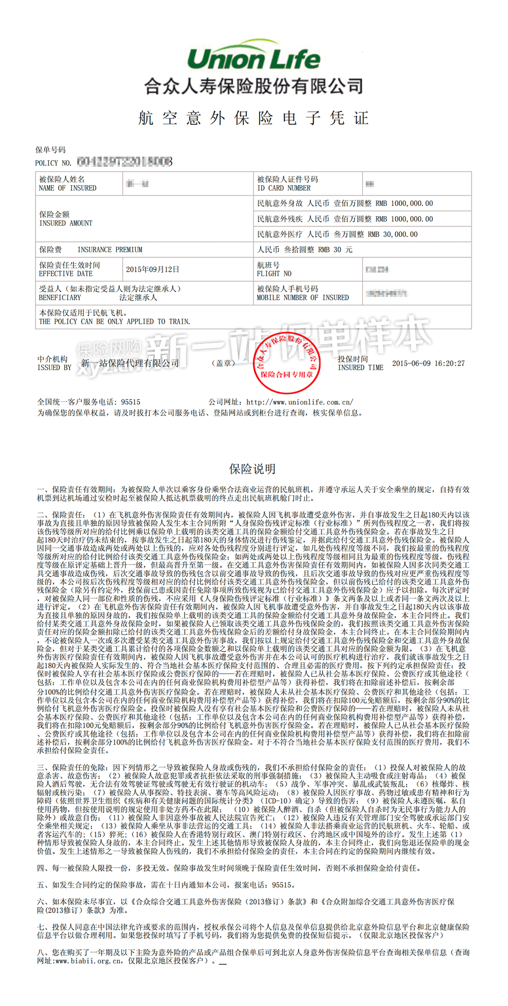 合众人寿航空意外保障计划升级版 保境内起飞航班