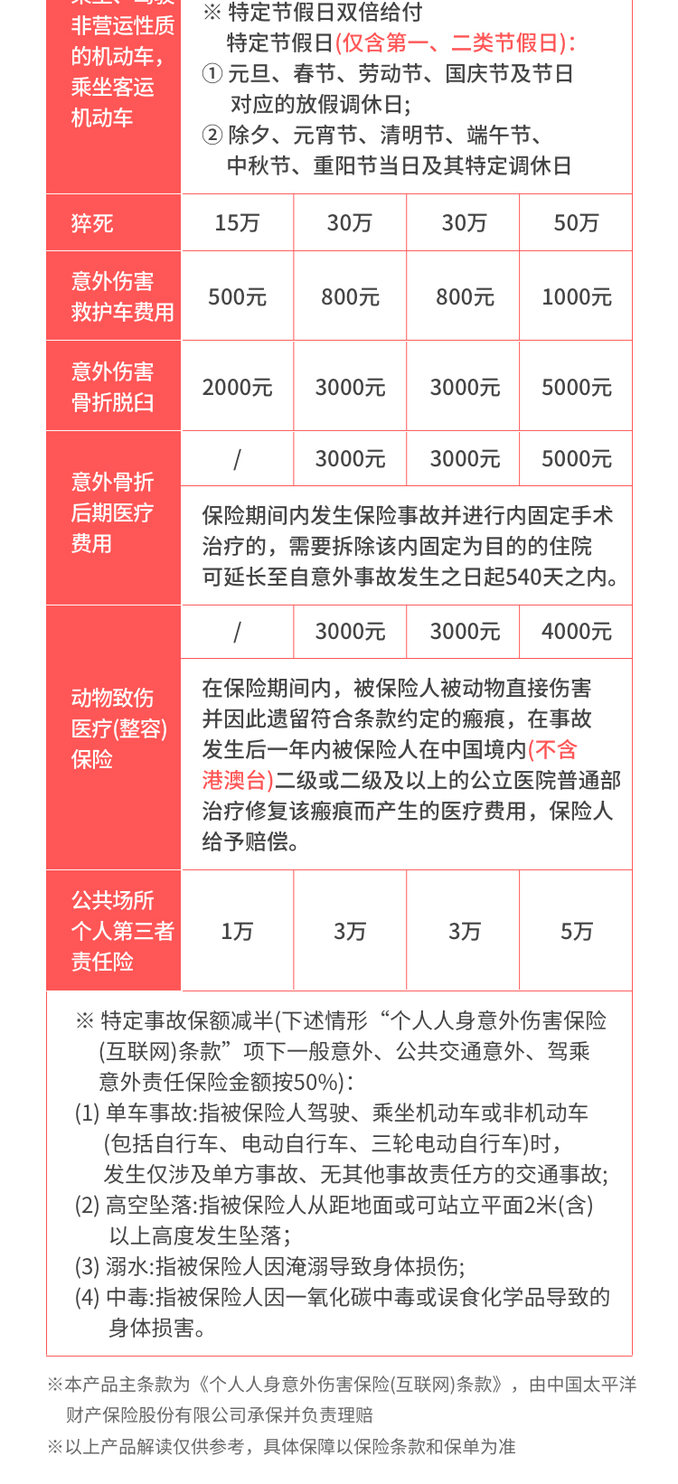 | 意外身故/伤残 | 30万元 | 在保险期间内,若被保险人遭受意外伤害,并自意外伤害发生之日起180日内以该次意外伤害为直接原因身故的,保险公司按照保险单所载该被保险人意外伤害保险金额给付身故保险金,对该被保险人的保险责任终止;若因该意外伤害事故致《人身保险伤残评定标准及代码》所列残疾之一的,保险公司按本保险合同所载的该被保险人意外伤害保险金额及该项残疾所对应的给付比例给付残疾保险金,累计达到保险金额时,对该被保险人的保险责任终止。(特定事故保额减半) |