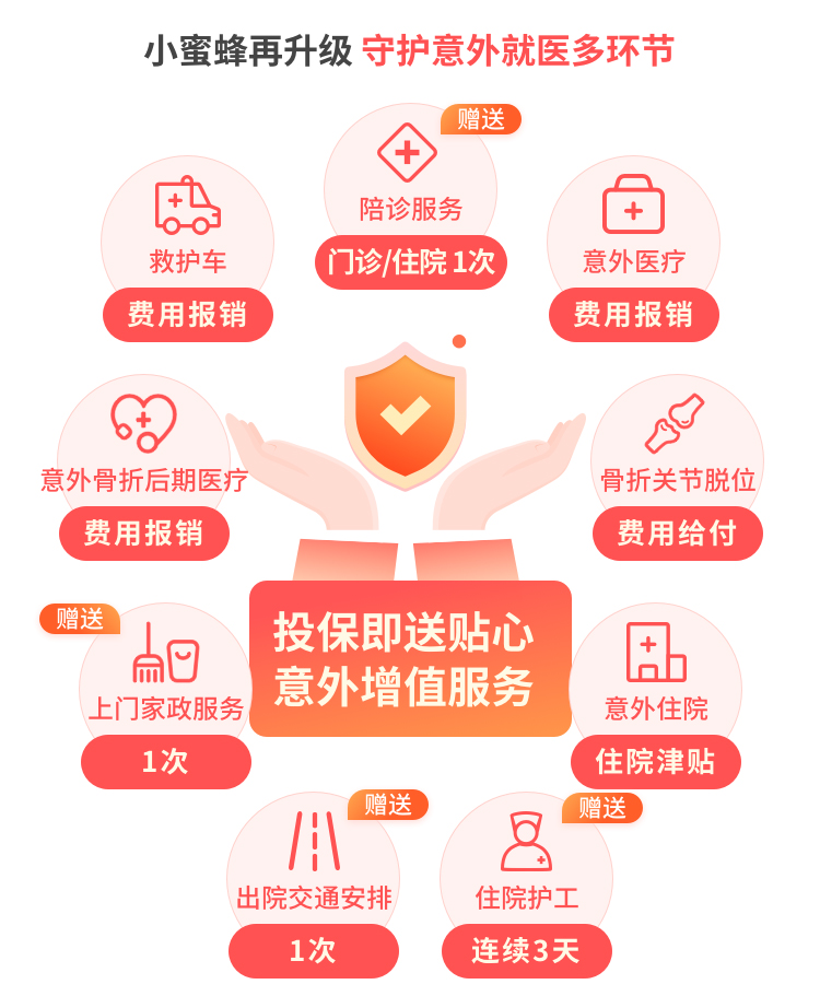 18. 本产品包含如下增值服务:医无忧服务(包括:意外门诊住院陪诊、住院专属护工、出院交通安排及陪护)和家无忧服务。详情可查看《增值服务手册》(点击可查看)。