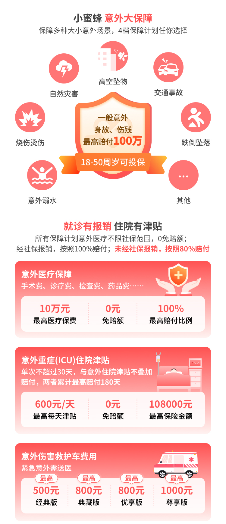 | 意外医疗 | 3万元 | 在保险期间内,若被保险人遭受主险合同责任范围内的意外伤害,在保险公司认可的医疗机构治疗所支出的合理且必要的医疗费用,保险公司承担保险金给付责任,累计达到保险金额时,本附加保险责任终止。不限社保范围内,每次事故免赔0元,若经社保报销,剩余部分按照100%赔付;若未经社保报销,剩余部分按照80%赔付。注:经过社保报销是指医保统筹报销金额大于零。被保险人优先从公费医疗、基本医疗保险以及其他政府举办的医疗保障项目,和被保险人工作单位、保险公司在内的商业保险机构等任何途径获取医疗费用补偿,剩余未能获得医疗费用补偿部分,将按以上约定计算并在责任限额内给付保险金,且最高给付金额不超过被保险人实际发生的医疗费用扣除其所获医疗费用补偿后的余额。保险期间届满被保险人治疗仍未结束的,保险公司继续承担保险金给付保险责任,住院治疗者最长至意外伤害发生之日起第一百八十日止,门诊治疗者最长至意外伤害发生之日起第十五日止。 |