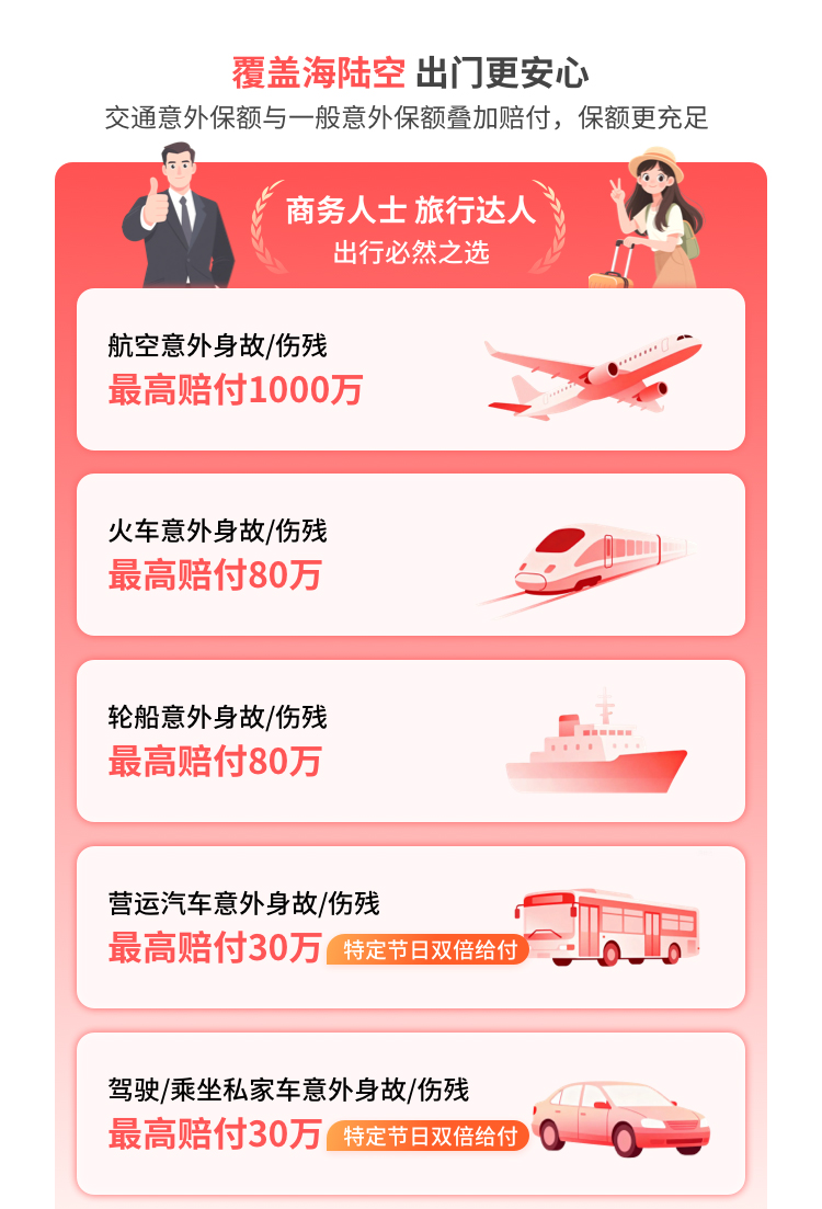 | 乘坐客运机动车意外身故/伤残(特定节假日双倍给付) | 20万元 | 在保险期间内,若被保险人在乘坐客运机动车时遭受意外伤害,并自意外伤害发生之日起180日内以该次意外伤害为直接原因身故的,保险公司按照保险单所载该被保险人意外伤害保险金额给付身故保险金,对该被保险人的保险责任终止;若因该意外伤害事故致《人身保险伤残评定标准及代码》所列残疾之一的,保险公司按本保险合同所载的该被保险人意外伤害保险金额及该项残疾所对应的给付比例给付残疾保险金,累计达到保险金额时,对该被保险人的该项保险责任终止。(本保险责任可与意外身故/伤残累计赔付)(特定事故保额减半) |