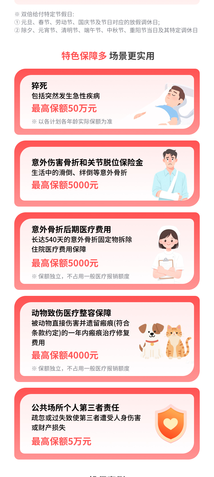 13. 本保险产品附加节假日加倍给付保障仅针对驾驶非营运性质的机动车、乘坐非营运性质的机动车、乘坐客运机动车三项交通意外身故、伤残保障双倍给付(即额外1倍给付),限特定节假日(即仅含第一、二类节假日):①元旦、春节、劳动节、国庆节及节日对应的放假调休日;②除夕、元宵节、清明节、端午节、中秋节、重阳节当日及其特定调休日;前述节假日恰逢重叠时,加倍给付不累加计算,按高者执行。第三类节假日中的星期六、星期天及被保险人的生日不额外给付。