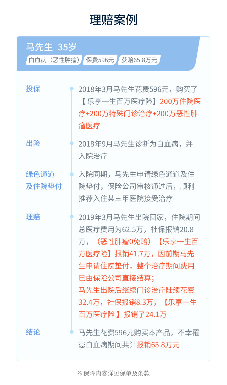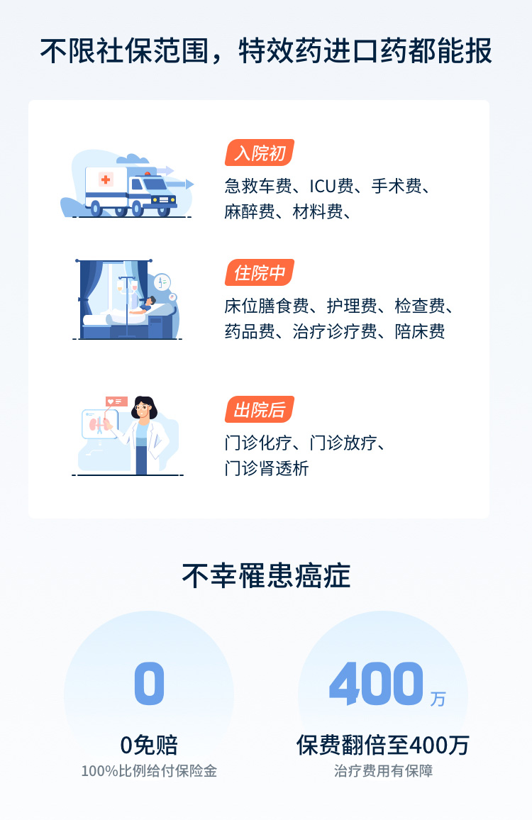 | 恶性肿瘤医疗 | 200万元 | 保障被保险人在保险期间内,如患疾病(等待期60日)或发生意外事故确诊首次患恶性肿瘤,因该恶性肿瘤住院医疗(含日间住院)和特殊门诊医疗产生的合理费用,在“住院医疗”累计给付达到保额后,剩余部分按免赔额0元、100%比例给付保险金: |