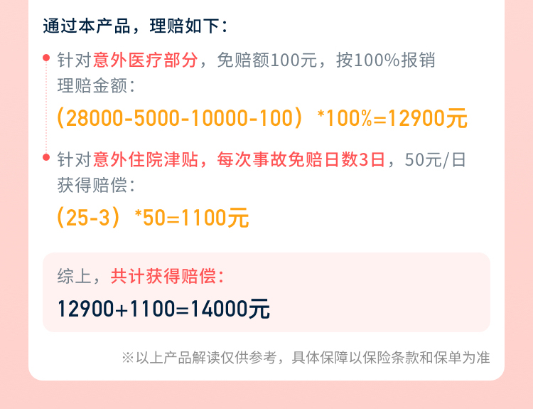 | 意外医疗 | 1万元 | 保障被保险人在保险期间内,如遭受意外伤害事故,自该事故发生之日起180日内,因该事故在医疗机构进行必要的治疗产生的合理医疗费用,按免赔额100元,100%比例给付保险金: