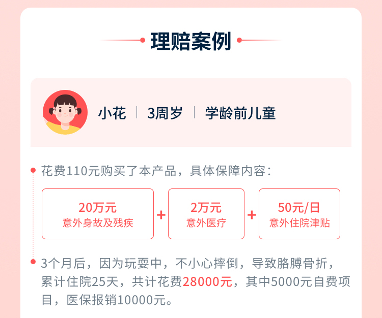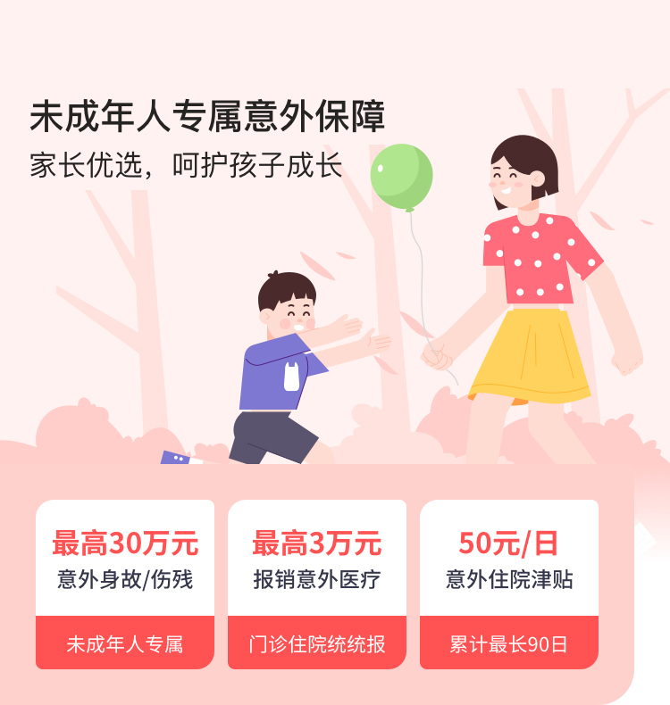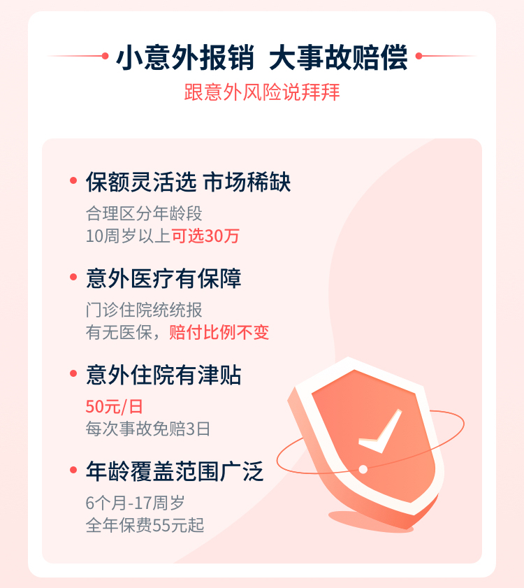 | 意外住院津贴 | 50元/日 | 保障被保险人在保险期间内,如遭受意外伤害事故,自该事故发生之日起180日内,因该事故经医疗机构诊断必须住院治疗,对每次住院合理的实际住院天数,每日按约定意外住院津贴给付意外住院津贴保险金: