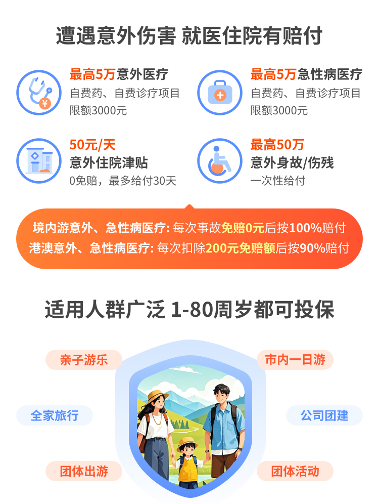 | 意外医疗 | 1万元 | 在保险期间内,被保险人在保单列明的承保区域内旅行期间遭受主险合同责任范围内的意外伤害,并自事故发生或发病之日起一百八十日内(含)所支出的合理且必要的医疗费用,保险公司在保险金额范围内按约定承担保险金给付责任。(每次事故免赔0元后按100%赔付,医疗费用限医保范围内,拓展必要且合理的自费药和自费诊疗项目,限额3000元。出险地点为香港、澳门的意外医疗及急性病医疗按每次事故免赔200元后按90%赔付) |