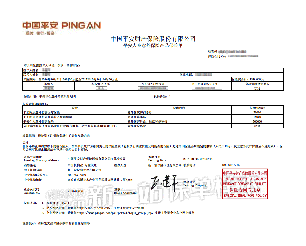 【信息披露】本保险产品由中国平安财产保险股份有限公司承保,面向全国(港、澳、台地区除外)销售(查询保险公司分支机构),销售主体为新一站保险代理股份有限公司;投保咨询、保单/凭证查询、客户投诉以及投保、承保、理赔、保全、退保等相关事务,由新一站保险网协助办理,新一站全国统一客服电话:400-667-5599。