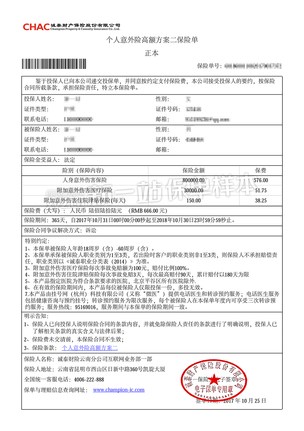 - 综合意外,80万意外保障