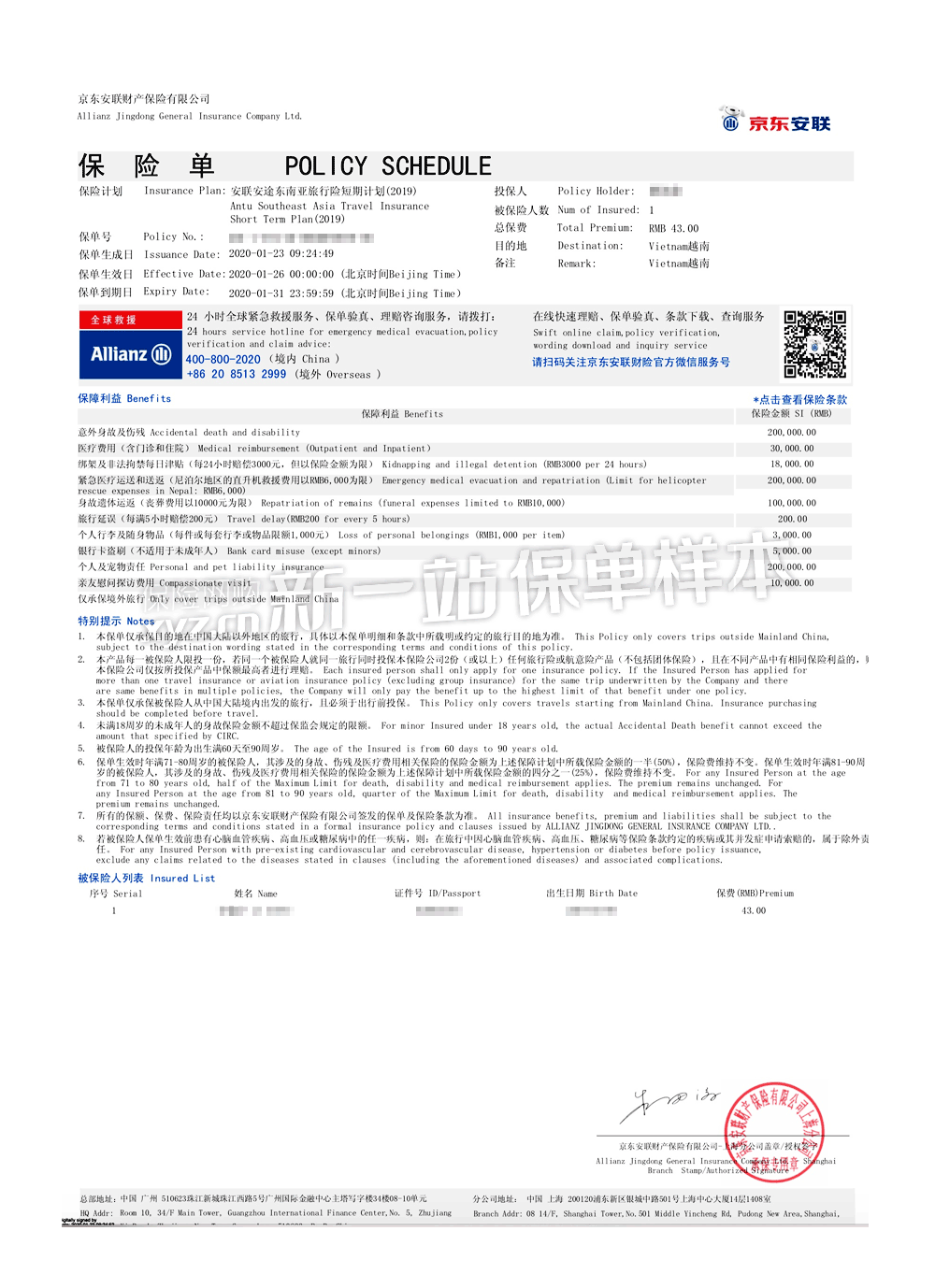 【保障区域】东南亚国家及地区:文莱、柬埔寨、香港、印尼、老挝、越南、澳门、马来西亚、缅甸、新加坡、台湾、泰国、菲律宾、东帝汶。