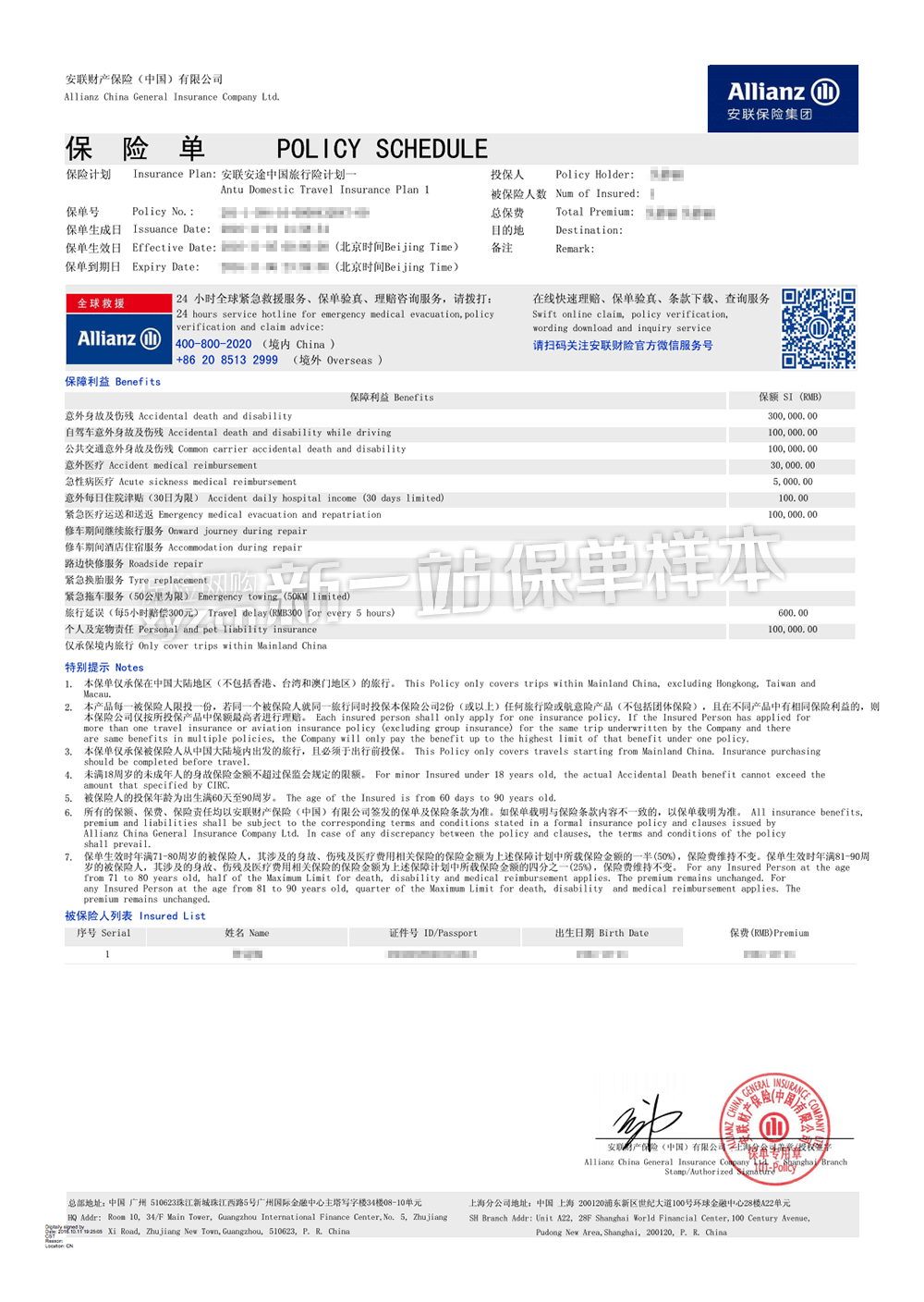 【保额说明】安联财产保险(中国)有限公司申明:同一被保险人就同一旅行投保该公司2份以上(含2份)旅行险或航意险产品(不包括团体保险),同类保障按其中最高一项保额给付保险金。