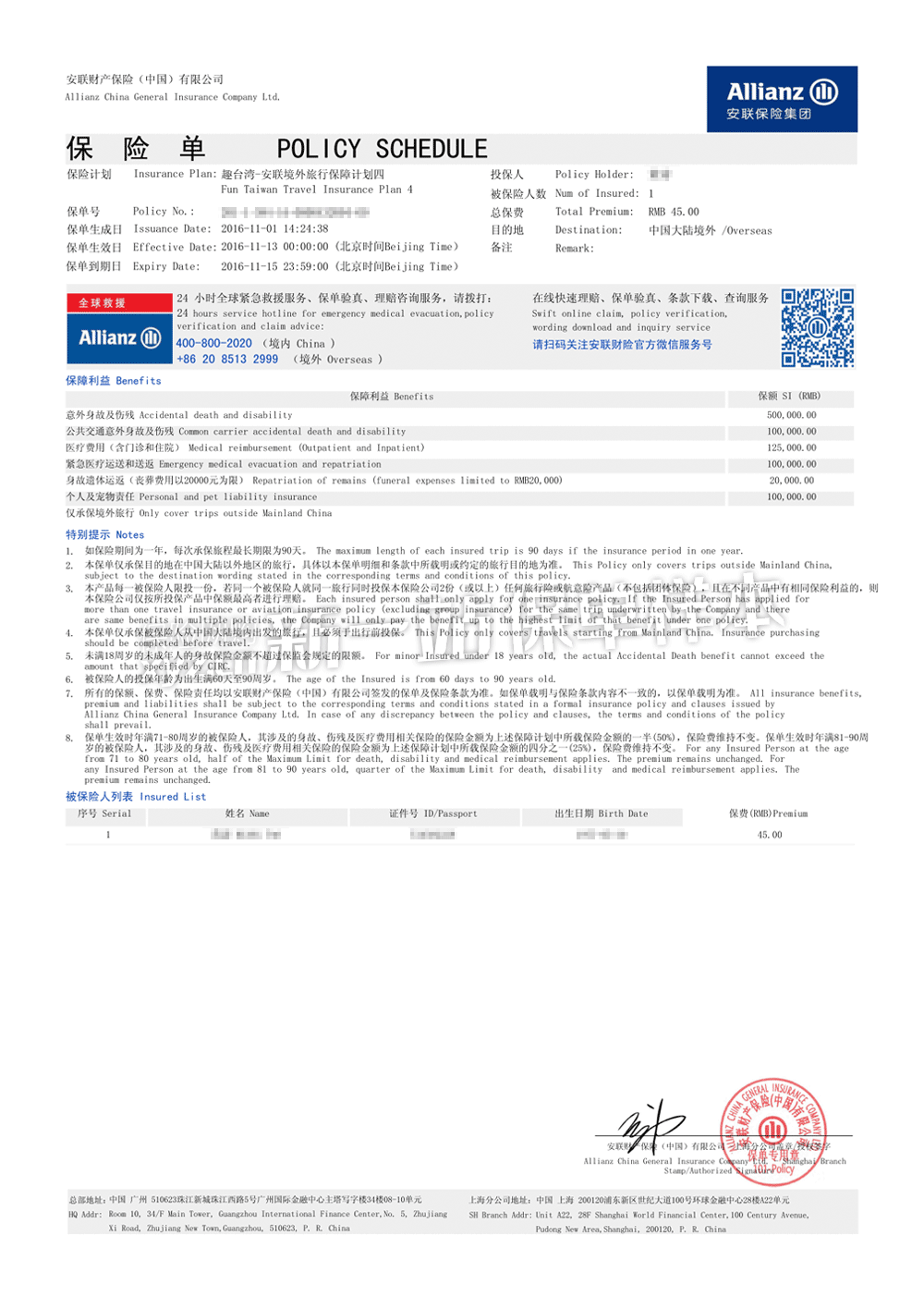 【保额说明】安联财产保险(中国)有限公司申明:同一被保险人就同一旅行投保该公司2份以上(含2份)旅游保险,同类保障按其中最高一项保额给付保险金。