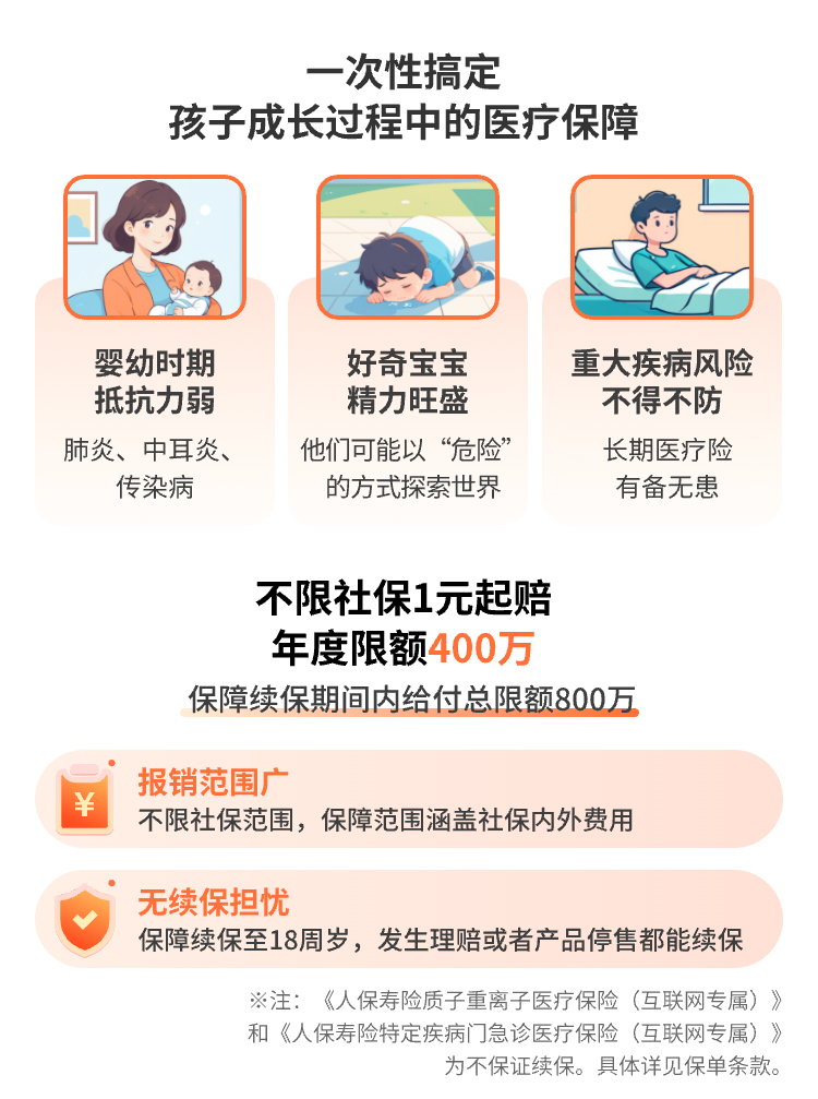 【适用人群】人保寿险关爱 e 生少儿长期医疗保险(费率可调)(互联网专属)、人保寿险特定疾病门急诊医疗保险(互联网专属)投保年龄为出生 0 天-17 周岁,续保年龄最高为 18 周岁。同时,对于年满 14 周岁的被保险人,首个保单年度,人保寿险赠送人保寿险质子重离子医疗保险(互联网专属)产品保障,不向您收取保险费,自第二个保单年度起需要您主动提出续保申请,续保需付费。如您选择续保本产品,则需同时交纳续保保险费;如您选择不续保本产品,人保寿险不会收取续保保险费,同时本产品保障终止。