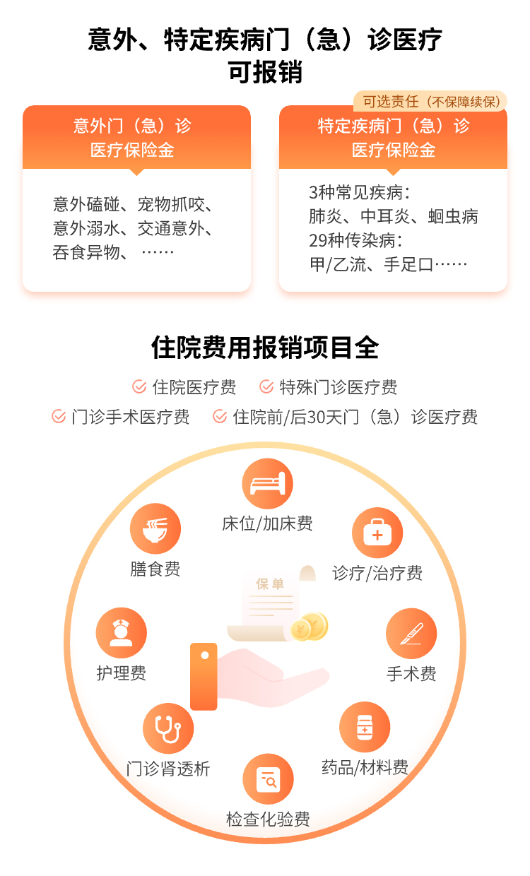 | 特定疾病门(急)诊医疗保险金(可选,不保证续保) | 不投保 | 不保证续保,次年需手动重新投保,重新投保无需健康告知。本合同约定的29种传染病等待期为7天,肺炎、中耳炎、蛔虫病等待期为90天,意外伤害无等待期;被保险人于等待期后确诊患有本合同约定的特定疾病并接受门(急)诊治疗的,对于被保险人在保险公司认可的医院的普通部(不包括特需医疗部,国际医疗部、干部病房、贵宾医疗部、外宾医疗部和VIP部)实际发生的、与治疗该特定疾病相关的、合理且必要的门(急)诊医疗费用,保险公司按本合同约定的医疗保险金计算方法给付特定疾病门(急)诊医疗保险金。在每个保险期间内,保险公司对特定疾病门(急)诊医疗保险金的累计给付限额为本合同的保险金额5万元。若投保时被保险人以有基本医疗保险或公费医疗身份投保,但就诊时未以基本医疗保险或公费医疗身份就诊并结算,则给付比例为60%;其他情形下给付比例为80%。 |