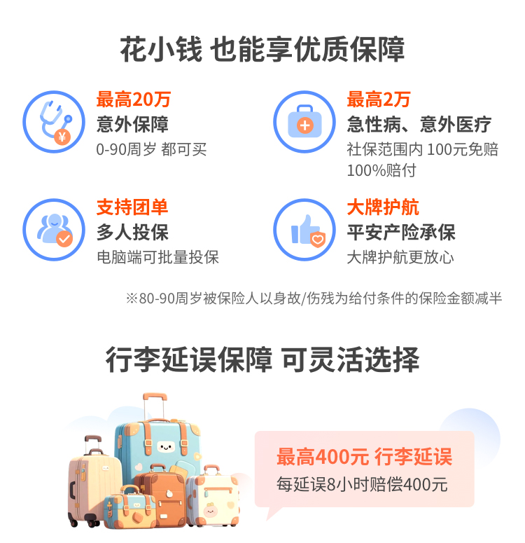 | 行李延误 | 不投保 | 保障被保险人在保险期间内,如在旅行的过程中将行李物品委托给其乘坐的固定航班飞机运输,因该航空公司的原因,导致在被保险人抵达目的地后,其托运的行李物品仍未能在保险单载明的时间内运抵的,每延误满8小时赔偿400元(按航班延后起飞时间计算延误时长),累计不超过保单约定金额。 |