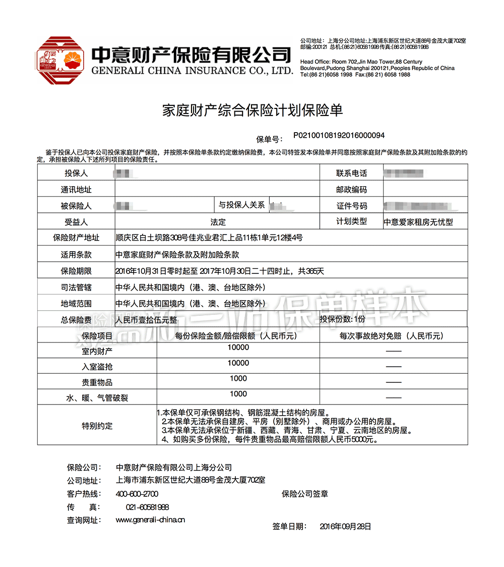 中意爱家“租房无忧“型家庭财产保险