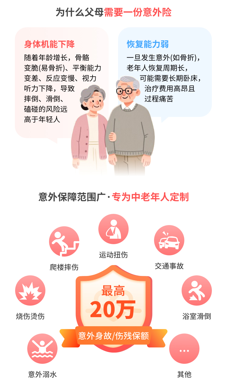 | 意外伤害骨折保险 | 2000元 | 在保险期间内,若被保险人遭受意外伤害事故被符合本产品医疗机构的专科医生确诊为《意外伤害骨折和关节脱位类型与保险金给付比例表》所列骨折或关节脱位之一的,按被保险人骨折或关节脱位所对应的给付比例乘以保险金额给付骨折保险金。被保险人因同一意外伤害事故导致一项以上骨折或关节脱位时,按高者给付。