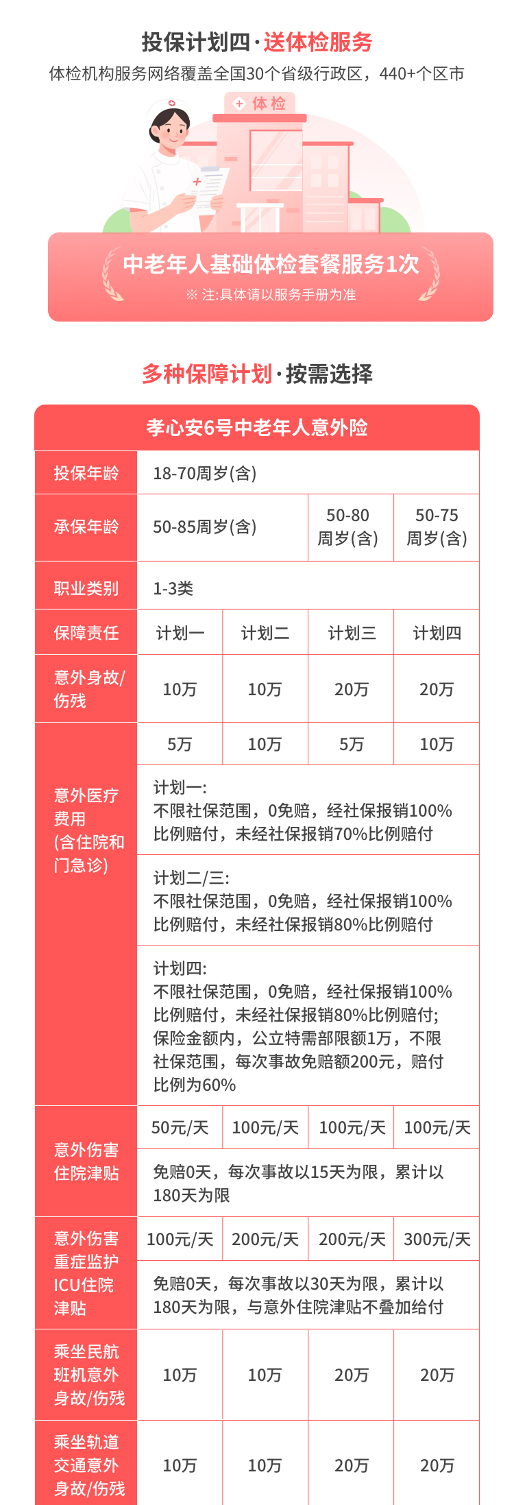 1. 投/被保险人:本产品计划一/计划二被保人承保年龄为50-85周岁,计划三被保人承保年龄为50-80周岁,计划四被保人承保年龄为50-75周岁,有完全民事行为能力和完全生活自理能力的自然人;不承保外籍(含港澳台)人士,保障范围为中华人民共和国境内(不含港澳台地区)发生的保险事故。投保人年龄需为18-70周岁(含)。