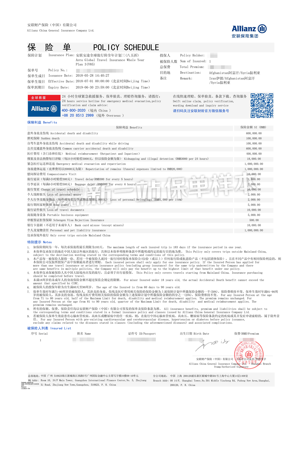 【保额说明】安联财产保险(中国)有限公司申明:同一被保险人就同一旅行投保该公司2份以上(含2份)旅游保险,同类保障按其中最高一项保额给付保险金。