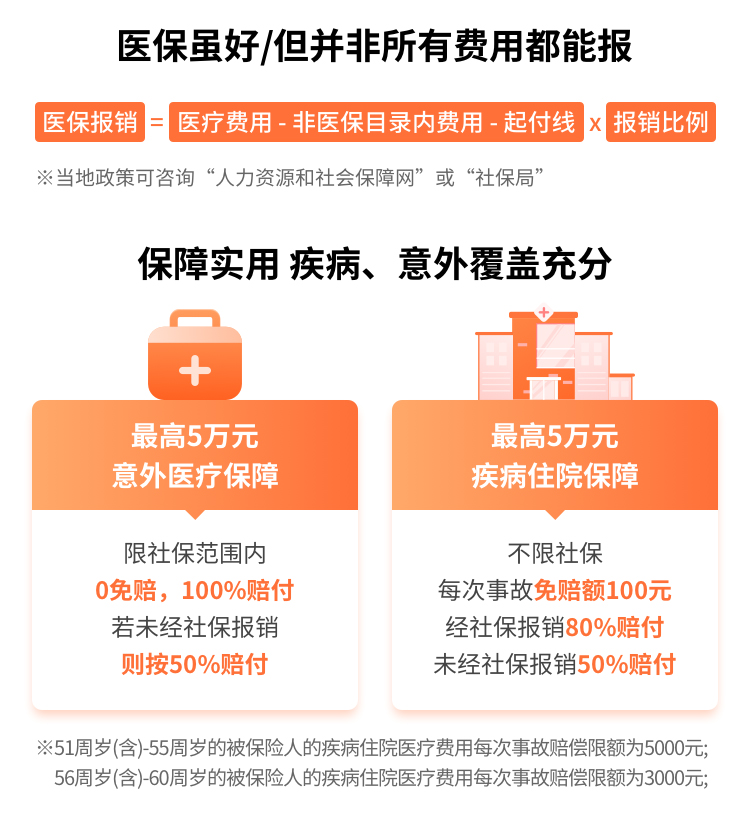 | 疾病住院医疗 | 1万元 | 在保险期间内,被保人自本保险合同生效之日起并在等待期后因罹患疾病,在中华人民共和国境内(不含港澳台)二级以上(含二级)公立医院或者保险公司认可的医疗机构住院治疗,保险公对被保险人所支出的合理且必要的实际住院医疗费用,在扣除本保险合同载明的免赔额后,按本保险合同约定的给付比例补偿被保险人疾病住院医疗保险金。(1、医疗费用不限社保,经社保报销80%赔付,未经社保报销50%赔付;2、每次事故绝对免赔额100元;3、51周岁(含)-55周岁的被保险人的疾病住院医疗费用每次事故赔偿限额为5000元;56周岁(含)-60周岁的被保险人的疾病住院医疗费用每次事故赔偿限额为3000元;4、疾病等待期90天) |