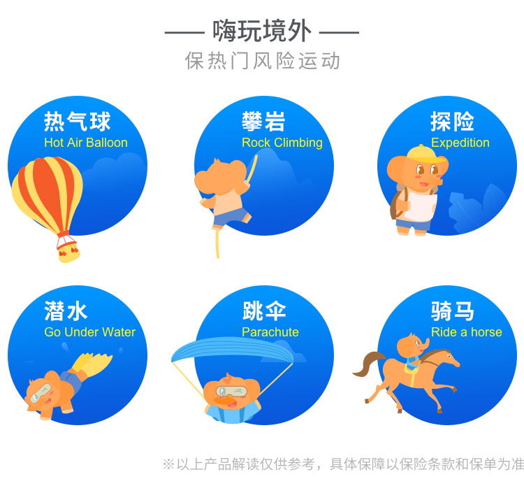 | 高风险运动意外伤害 | 35万元 | 保障被保险人在保险期间内,如在旅行时参加如“投保须知”所述运动发生意外事故,因该事故导致身故或伤残: |