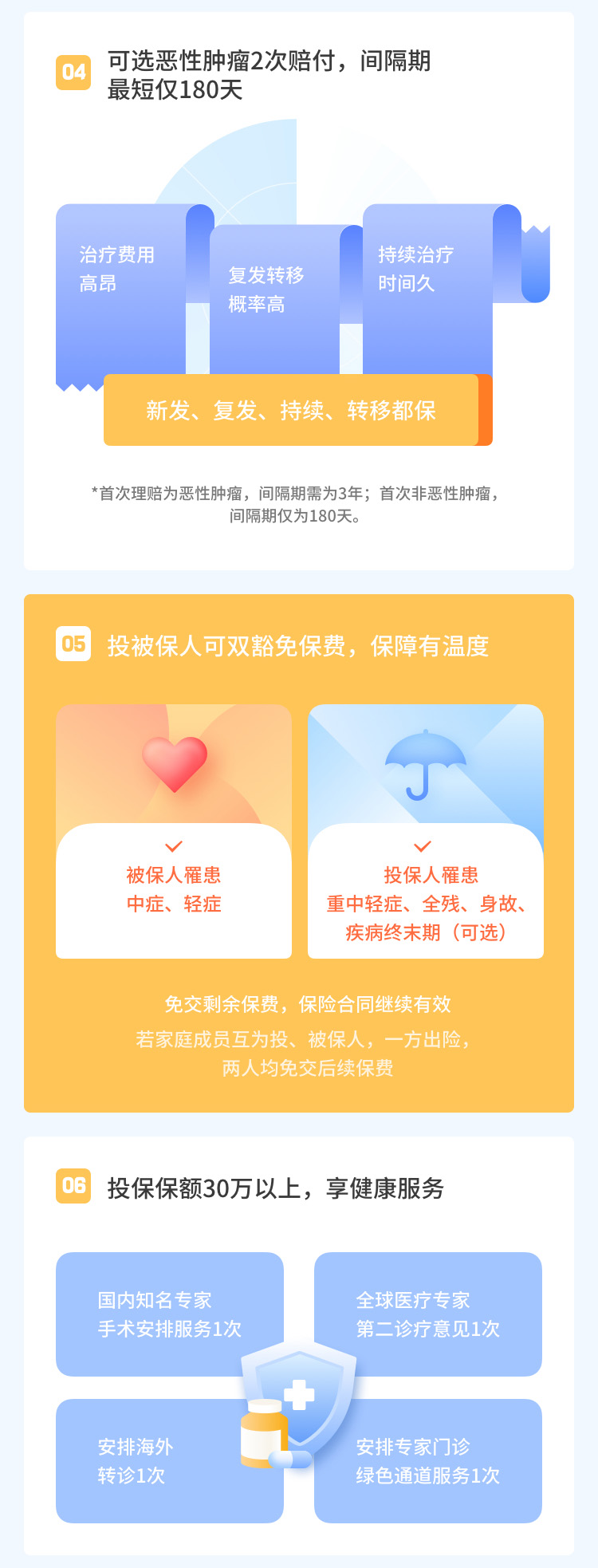 | 恶性肿瘤额外保险金 | 不投保 | 若首次发生的重大疾病为恶性肿瘤以外的其他重大疾病,且根据本合同约定给付重大疾病保险金后,自重大疾病确诊之日起180天后,在保险公司指定或认可的医疗机构由专科医生确诊初次发生恶性肿瘤,保险公司按本合同基本保险金额给付恶性肿瘤额外保险金,同时本合同终止。