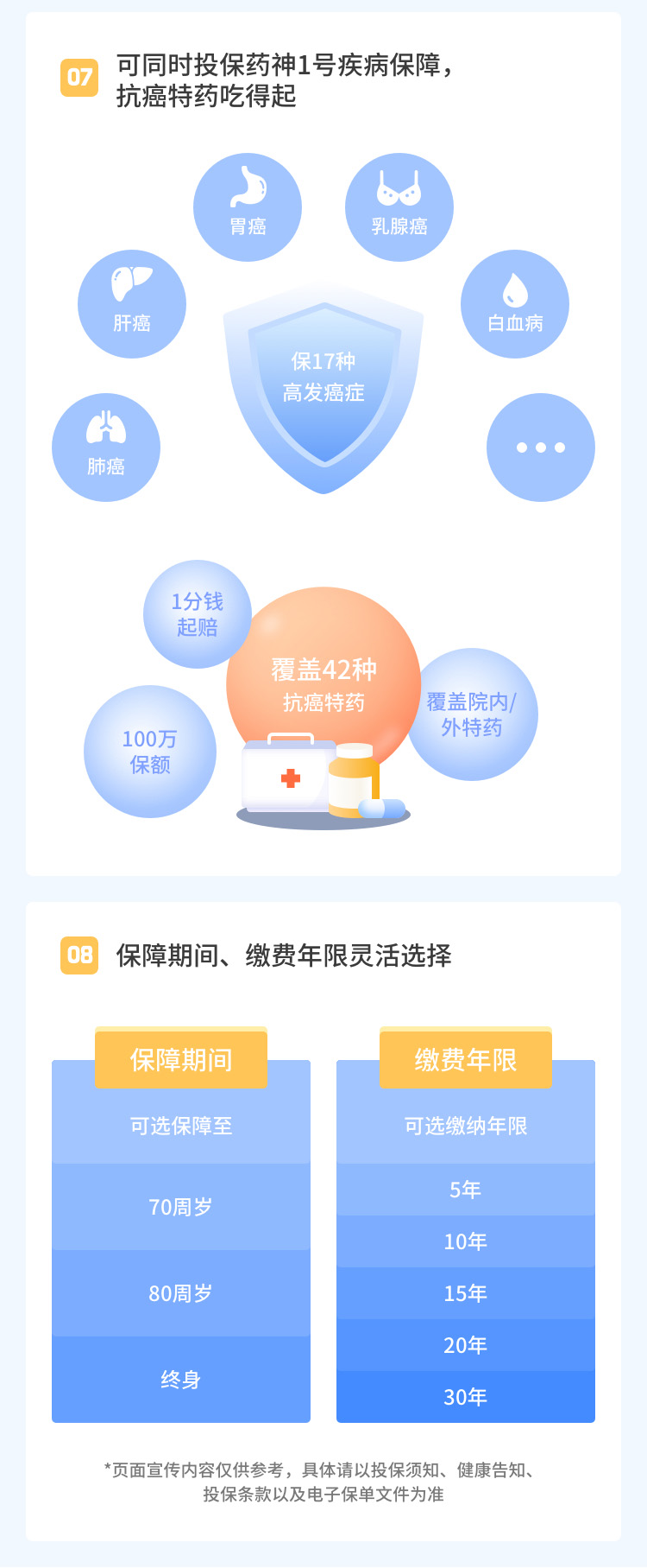 【轻症疾病说明】承保40种轻症疾病:极早期恶性肿瘤或恶性病变、不典型急性心肌梗塞、轻微脑中风后遗症、冠状动脉介入手术(非开胸手术)、较小面积Ⅲ度烧伤、脑垂体瘤/脑囊肿、脑动脉瘤及脑血管瘤、视力严重受损、心脏瓣膜介入手术(非开胸手术)、慢性肝功能衰竭失代偿早期、主动脉内手术(非开胸手术)、肝脏手术、急性坏死性胰腺炎腹腔镜手术、听力严重受损、心脏起搏器或除颤器植入、严重的骨质疏松、双侧睾丸切除术、双侧卵巢切除术、单侧肾脏切除、于颈动脉进行血管成形术或内膜切除术、心包膜切除术、硬脑膜下血肿手术、特定周围动脉疾病的血管介入治疗、植入腔静脉过滤器、早期象皮病、席汉氏综合症、系统性红斑狼疮、严重阻塞性睡眠窒息症、微创颅脑手术、轻度面部烧伤、无颅内压增高的微小良性脑肿瘤、风湿热导致的心脏瓣膜疾病、单侧肺脏切除术、头臂动脉型大动脉炎非开胸旁路移植手术、强直性脊柱炎的特定手术治疗、轻度脑炎或脑膜炎后遗症、轻度阿尔茨海默病、早期原发性心肌病、慢性肾功能障碍、人工耳蜗植入术。(详细病种解释见条款)