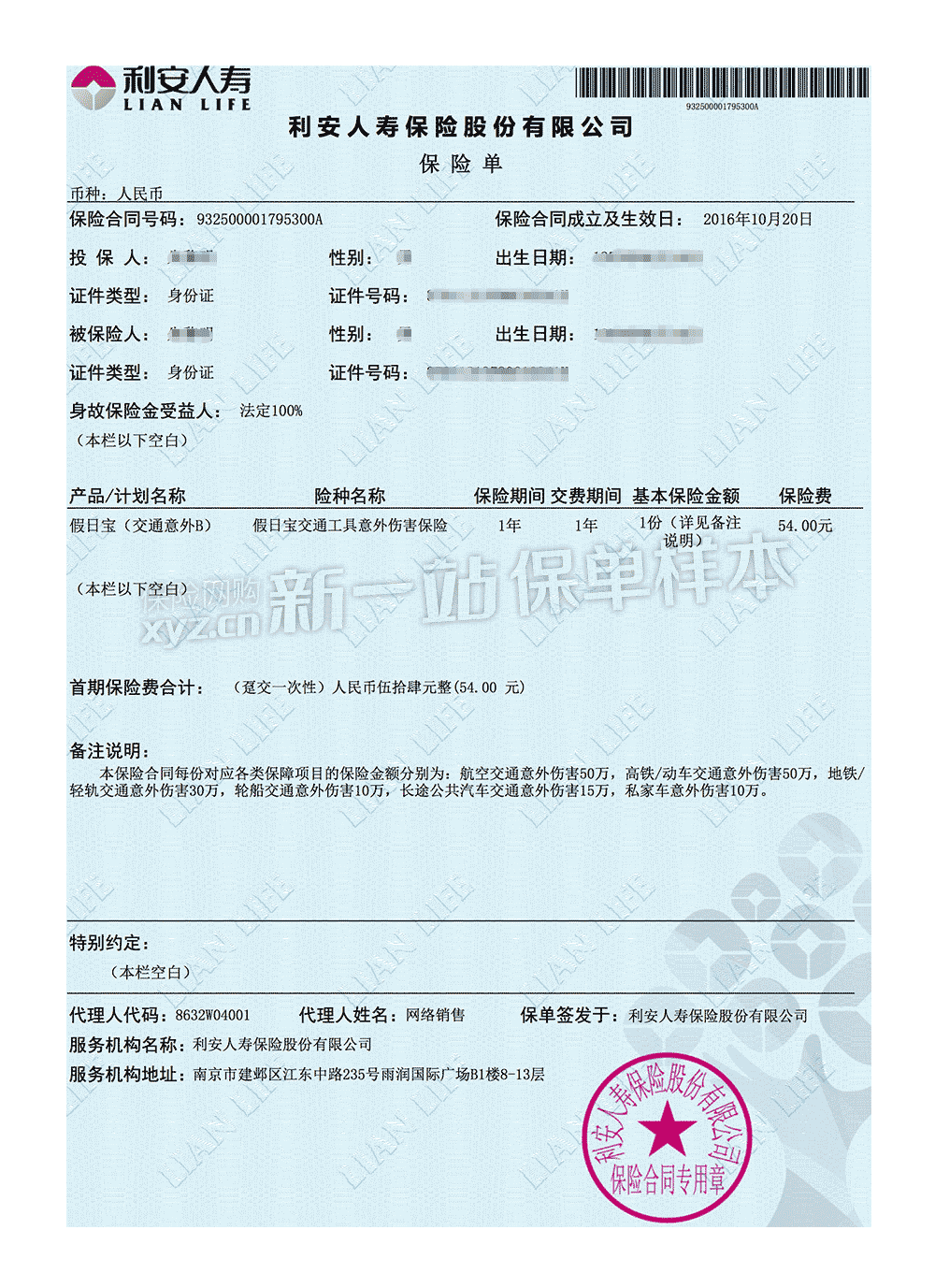 【信息披露】本保险由利安人寿保险股份有限公司承保(保险公司分支机构、产品备案编号),后续保全、理赔等相关事务,可由新一站保险网(xyz.cn)协助办理。