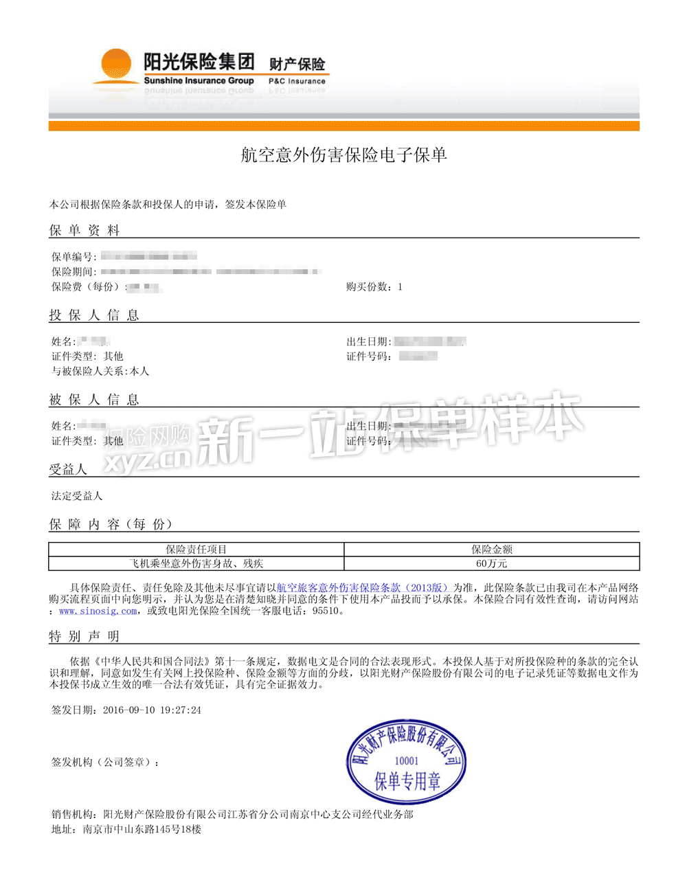 | 飞机意外伤害 | 60万元 | 保障被保险人在保险期间内,如乘坐民航班机发生意外伤害事故(自通过机场安检至抵达目的地出舱门止),自该事故发生之日起180日内因该事故导致身故或伤残: (1)身故,给付60万元保险金; (2)伤残,按保险条款规定比例给付保险金; (3)身故及伤残保险金,累计不超过60万元。 |