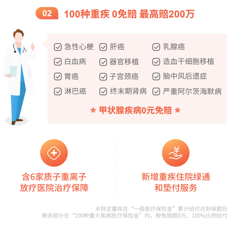 | 100种重大疾病医疗保险金 | 100万元 | 保障被保险人在保险期间内(等待期90日),如发生意外事故或等待期后因初次出现症状或体征且确诊罹患本保险约定的重大疾病,因该疾病治疗产生的合理住院医疗费用、6种重大疾病特殊门诊医疗费用(详见“投保须知”),在“一般医疗保险金”累计给付达到保额后,剩余部分按免赔额0元、100%比例给付保险金: (3)质子重离子医疗保险金:与100种重大疾病医疗共用保额,无单项治疗费用限制,保额内100%比例赔付; |
