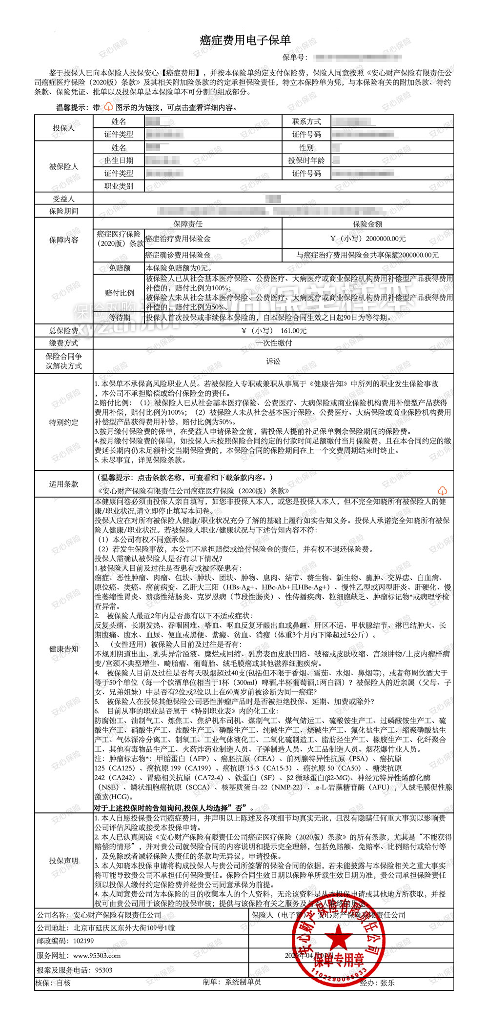 - 癌症医疗保险(2020版)条款-安心保险注册号:C00020332512020082506791