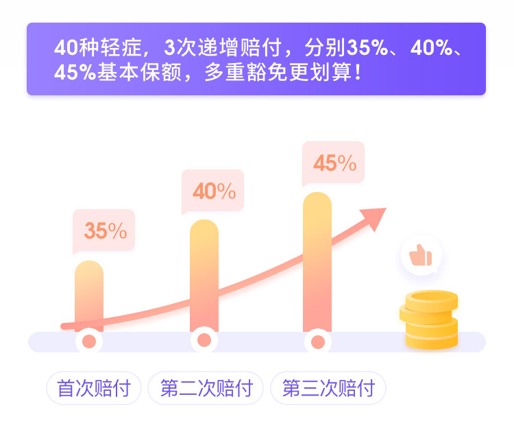 | 轻症疾病保险金 | 首次1.75万元,第二次2万元,第三次2.25万元 | 被保险人在保险期间内因意外或在本合同生效(若曾复效,则自本合同最后复效)之日起180日后因非意外的原因在保险公司指定或认可的医疗机构由专科医生确诊初次发生本合同列明的一种或多种轻症疾病,保险公司按本合同基本保险金额的一定给付比例给付轻症疾病保险金,本合同继续有效。